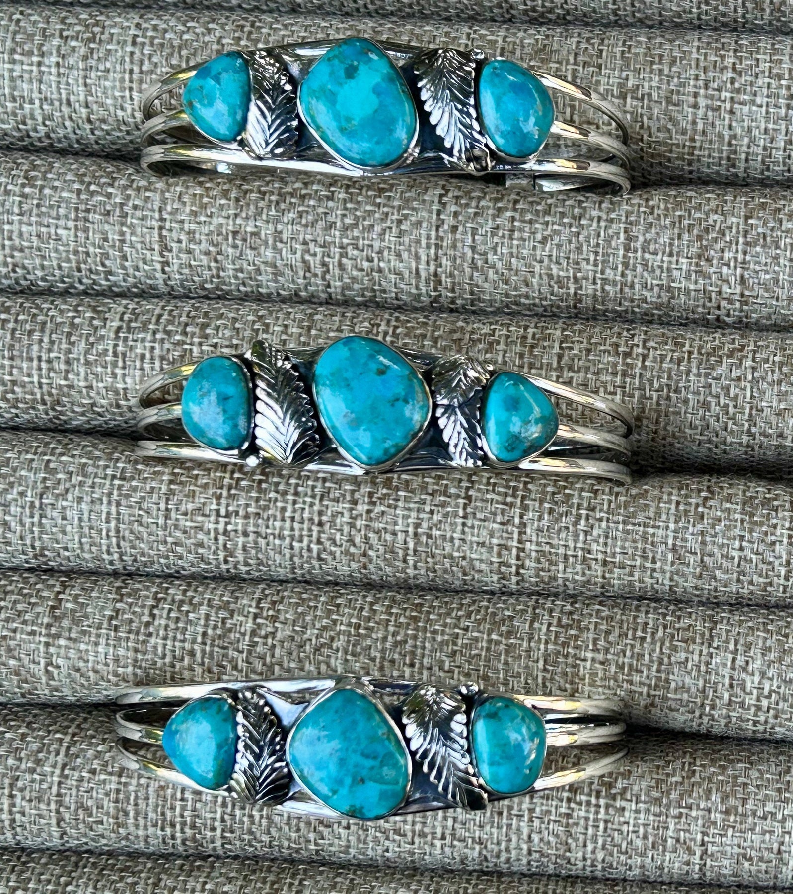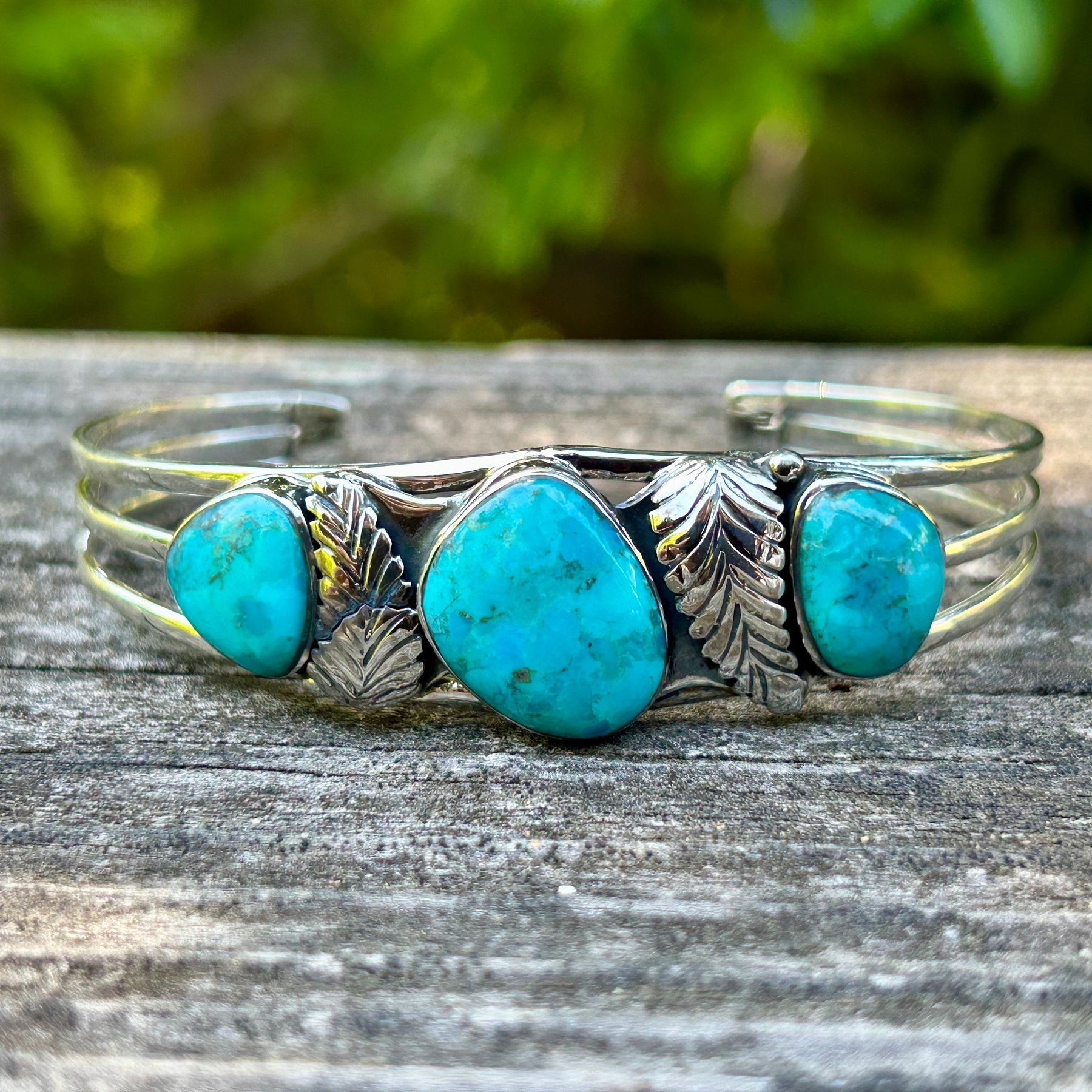 Genuine Turquoise Silver Feather 3 Stone Bracelet Turquoise Cuff Southwestern Style Cuff