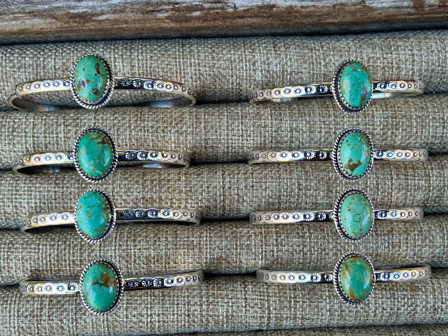 These are a simple Kingman Cuff that packs a nice pop of color on your wrist...add it to your turquoise and silver stack and now it's perfect. Sterling Silver and hallmarked Sterling and signed SHR.