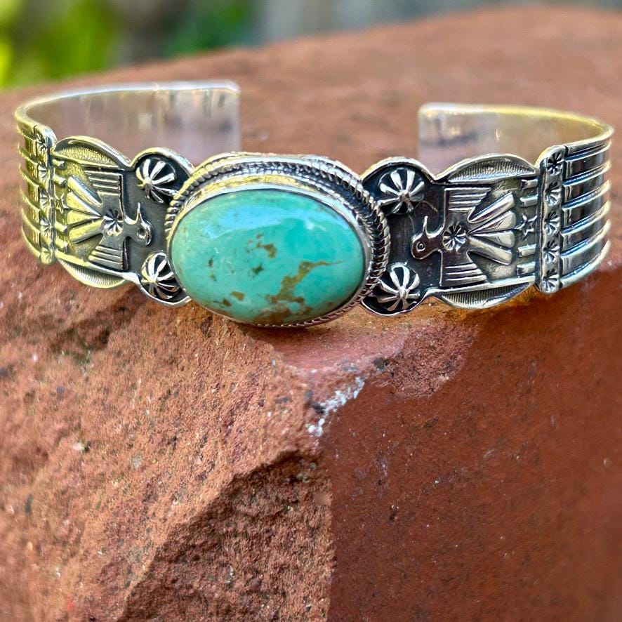 Kingman Turquoise Thunderbird Bracelet Cuff Handmade Stamped Sterling Signed Turquoise Cuff Thunderbird Cuff Turquoise Bracelet Southwest