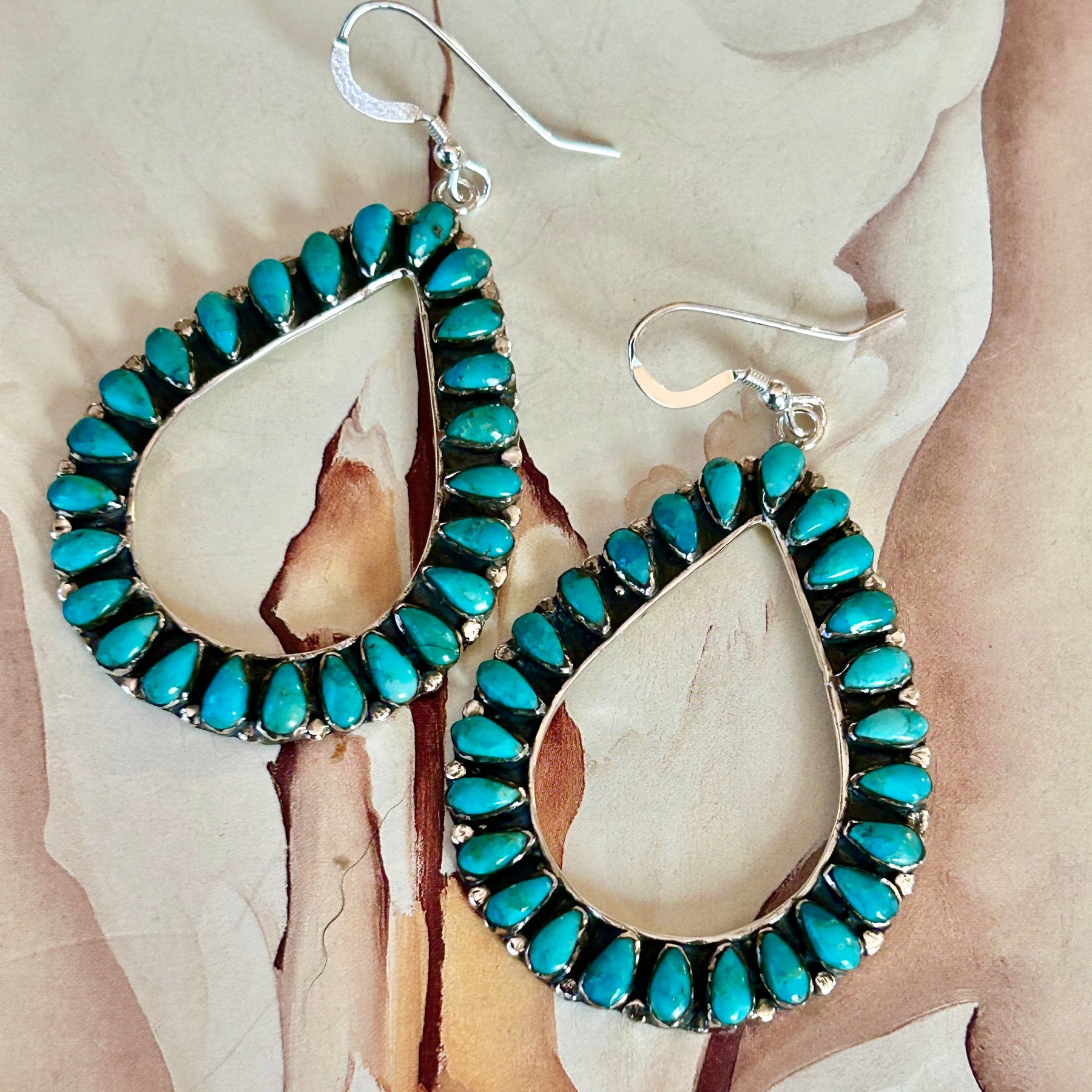 Handmade genuine turquoise teardrop hoop earrings set in sterling silver. These Western & Southwestern dangle earrings are lightweight yet bold, perfect for everyday wear or a special occasion. 24 teardrop shaped stones form a teardrop shaped hoop earring. The stones are such a beautiful turquoise color. These natural turquoise stones bring a touch of rustic elegance, making them a beautiful gift for her or a unique addition to your boho, western, or southwestern jewelry collection. They are perfect at 2"