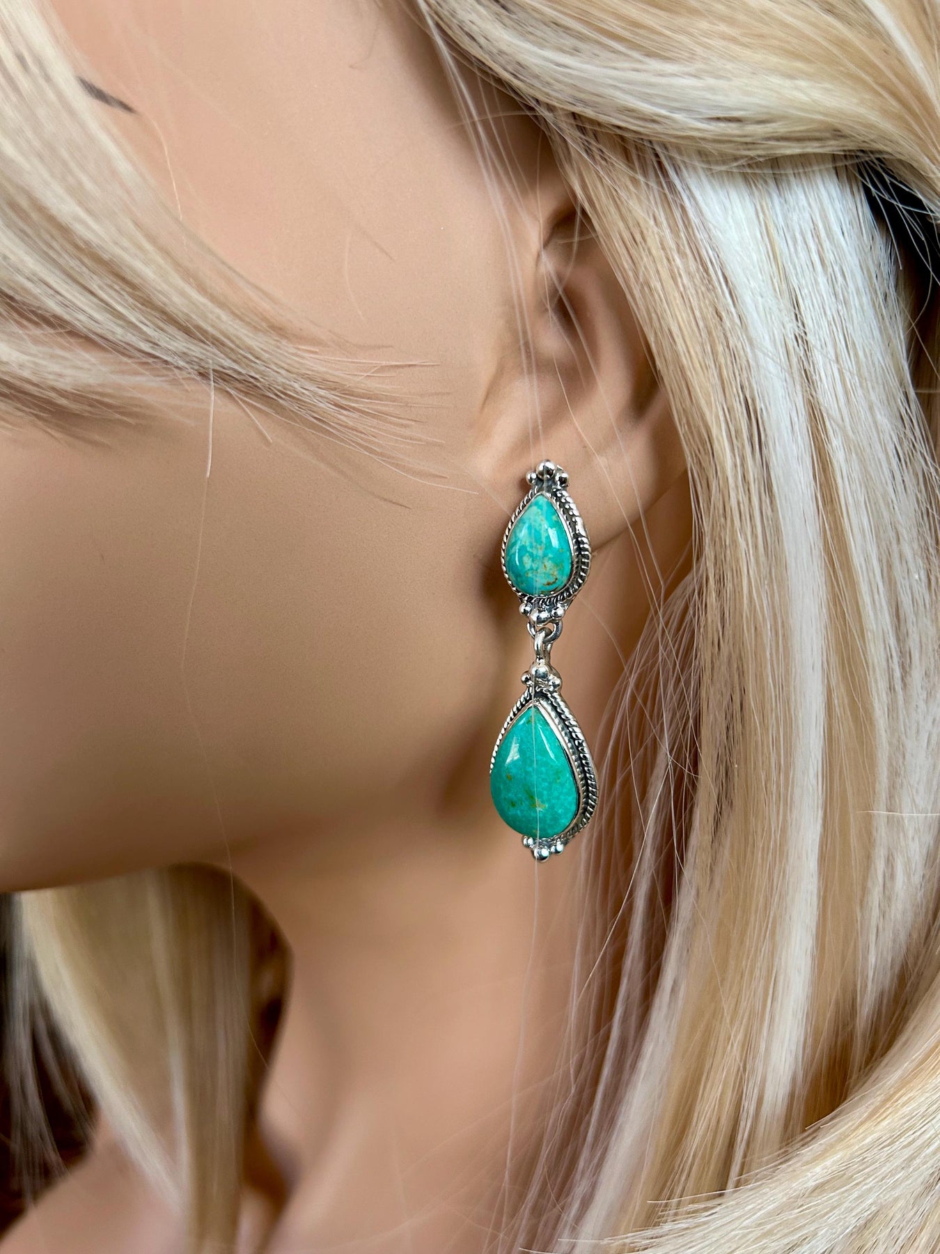 These are the perfect earrings. Anyone can wear these at 2" they are a perfect length with hair up or down. They are 7/8" wide so if your hair is down they can still be seen. Beautiful Royston turquoise color.