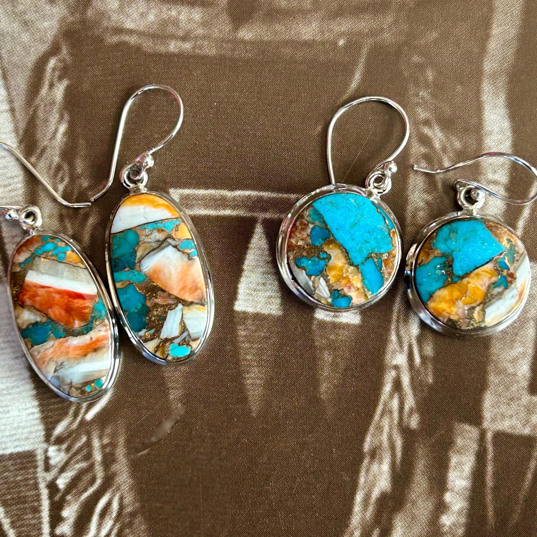 Who doesn't love Spiny Oyster? Skyhawk Ranch has quite a nice following of spiny collectors who absolutely love spiny oyster. You don't see it that much in earrings so these are kind of rare. The round ones are particularly unusual.. Spiny Oyster is a seashell that is merged with genuine turquoise to create such a beautiful effect. I always think Spiny Oyster looks like a beautiful sunset. All sterling silver.