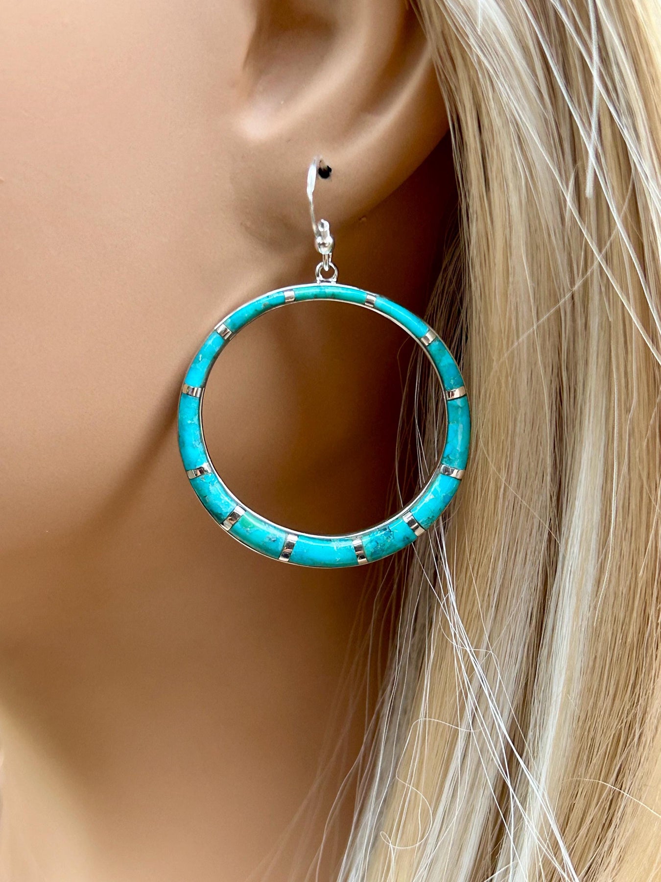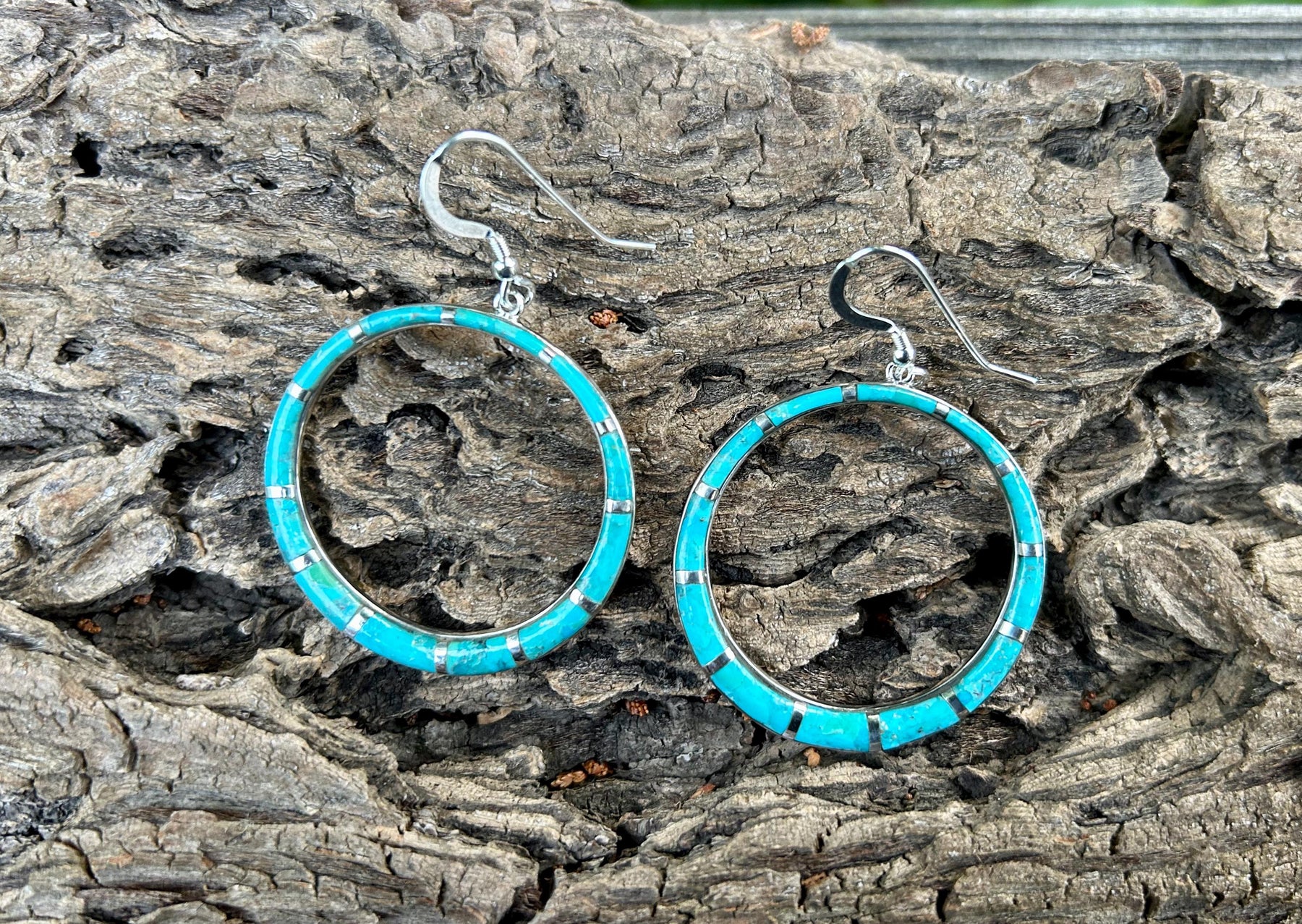 These are a sweet pair of turquoise hoops at 1.5" around. Silver inlay inbetween turquoise. Very lightweight and they hang really nice for hoops. Some hoops lay funny but these have a nice swivel so they hang just right.