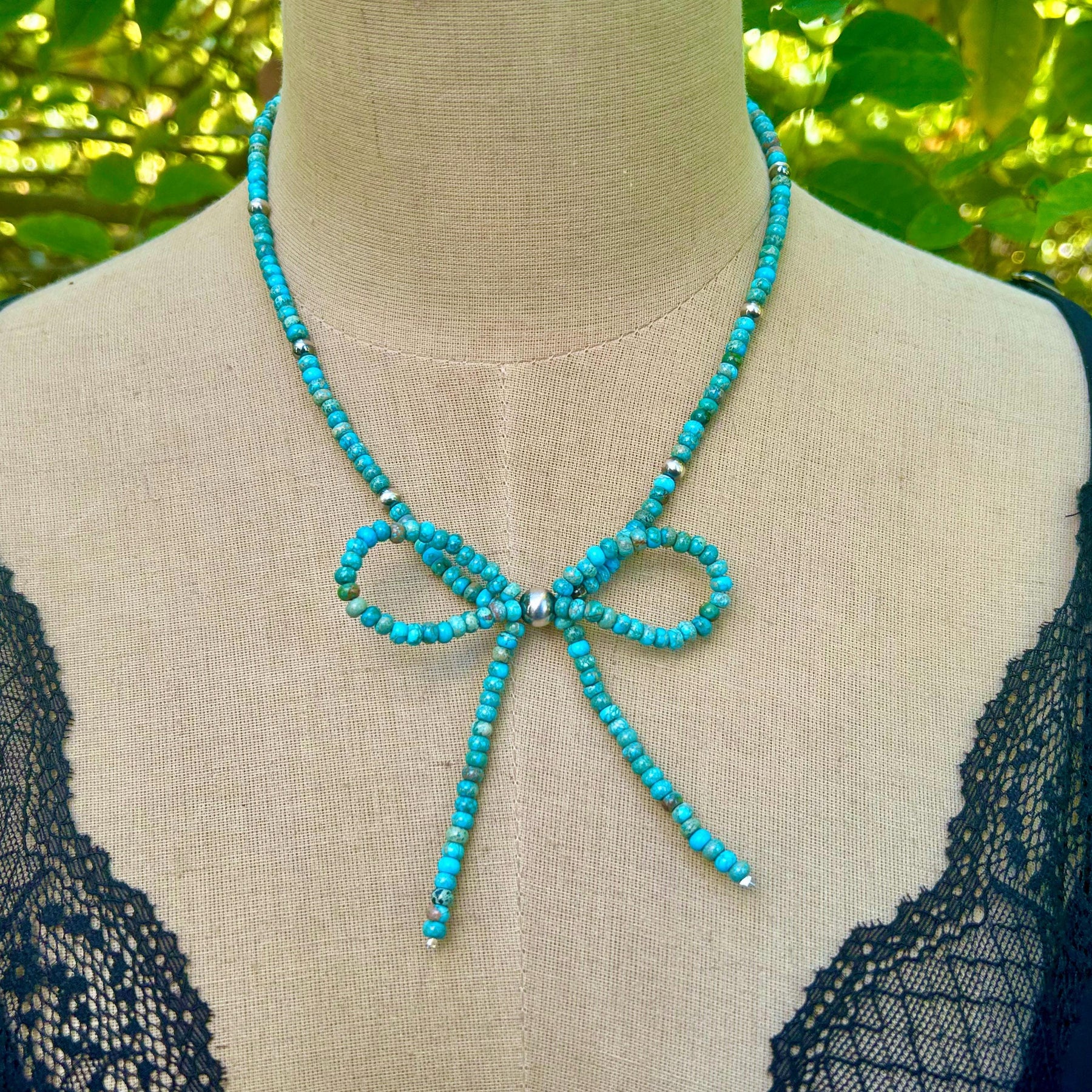 Genuine Turquoise Bow Necklace Rondelle Turquoise Beads with Sterling Silver. The beads in this bow necklace are gorgeous. Rondelle Turquoise beads with beautiful earthtone matrix in each bead. Not very often do you see them in turquoise. This is a Hot item...Trending!