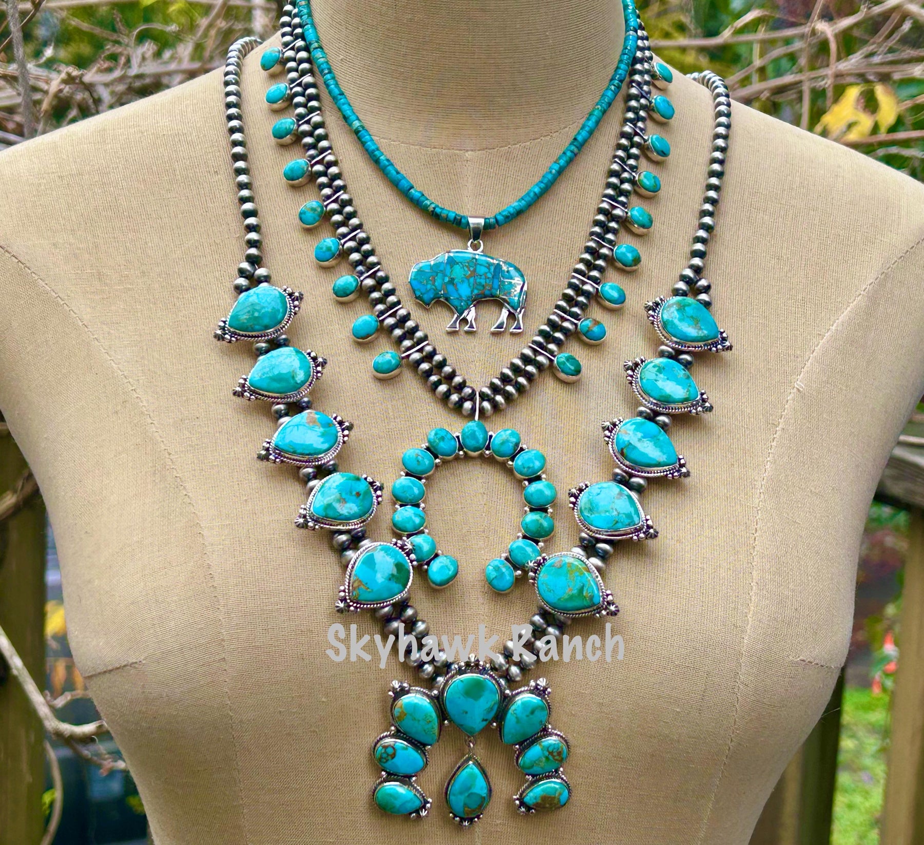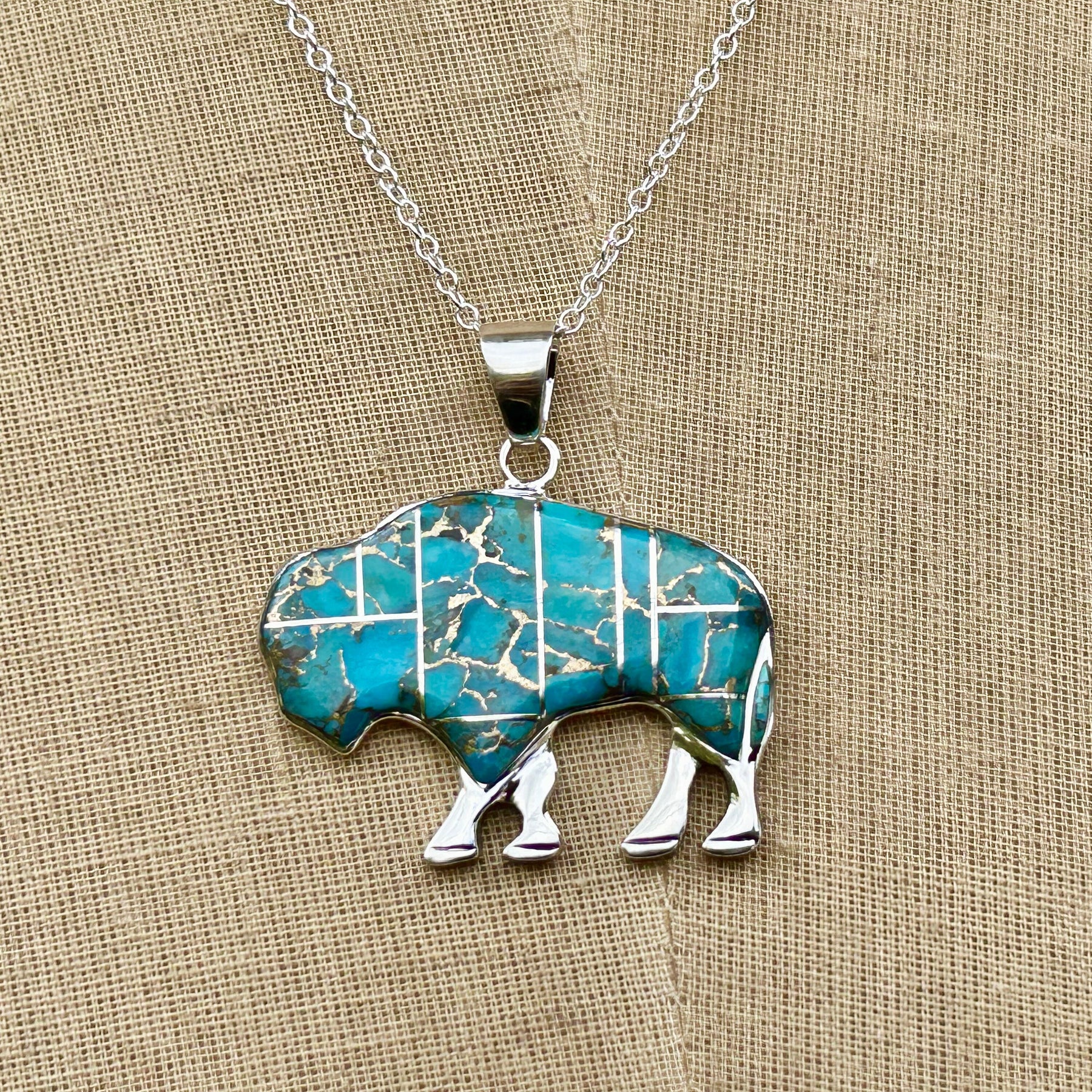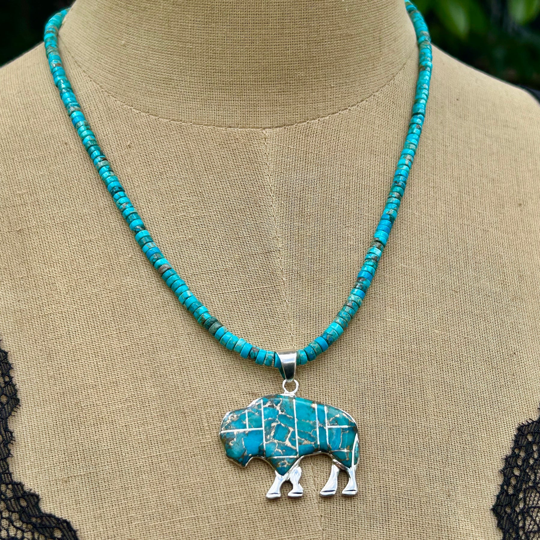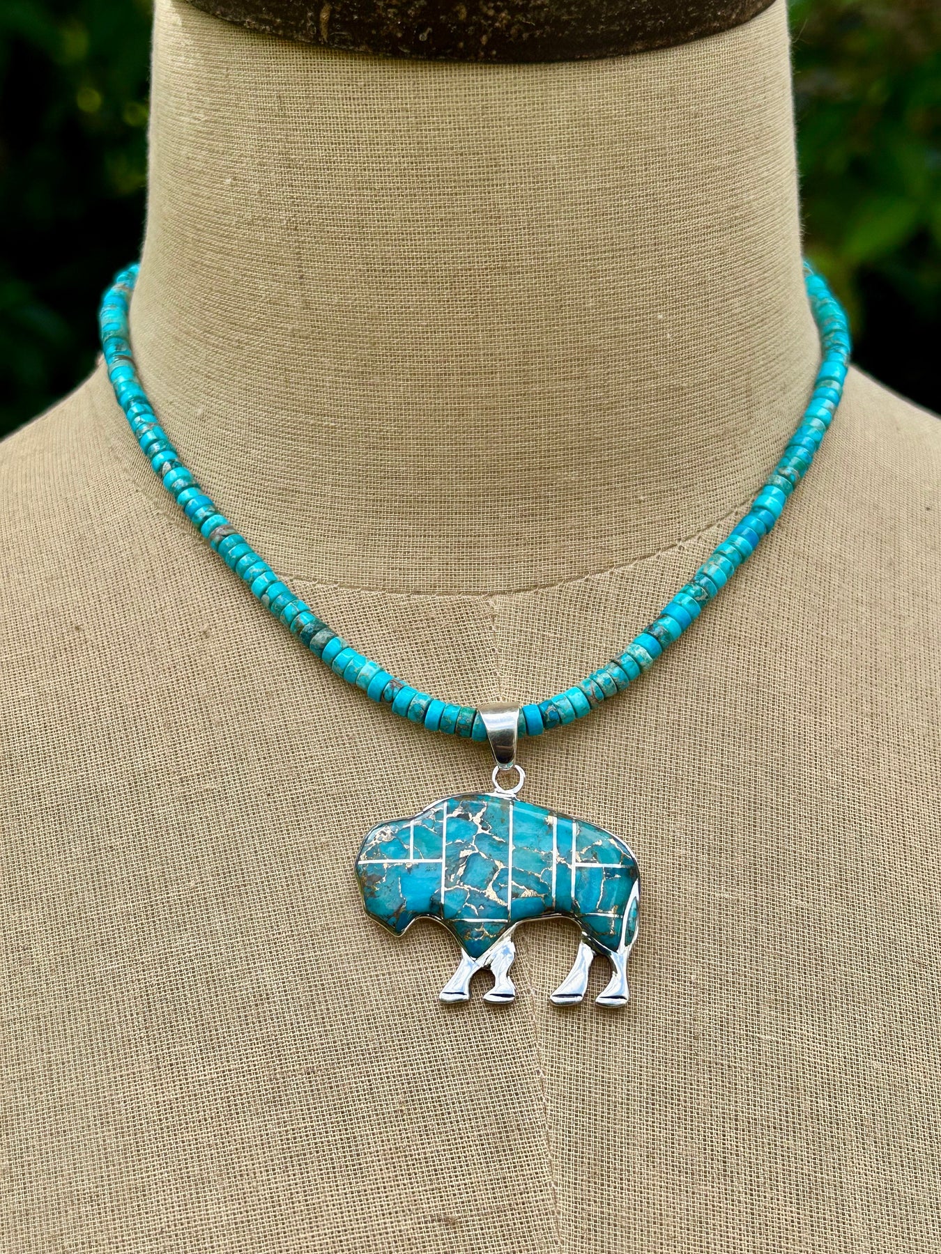 Genuine Turquoise Buffalo Beaded Necklace. The Buffalo is made with genuine Copper Turquoise and sterling silver. The necklace is handmade using genuine turquoise beads. Necklace can be used as a 20"" necklace or 15" choker. 18" Silver Chain can be switched out for turquoise necklace at same price.