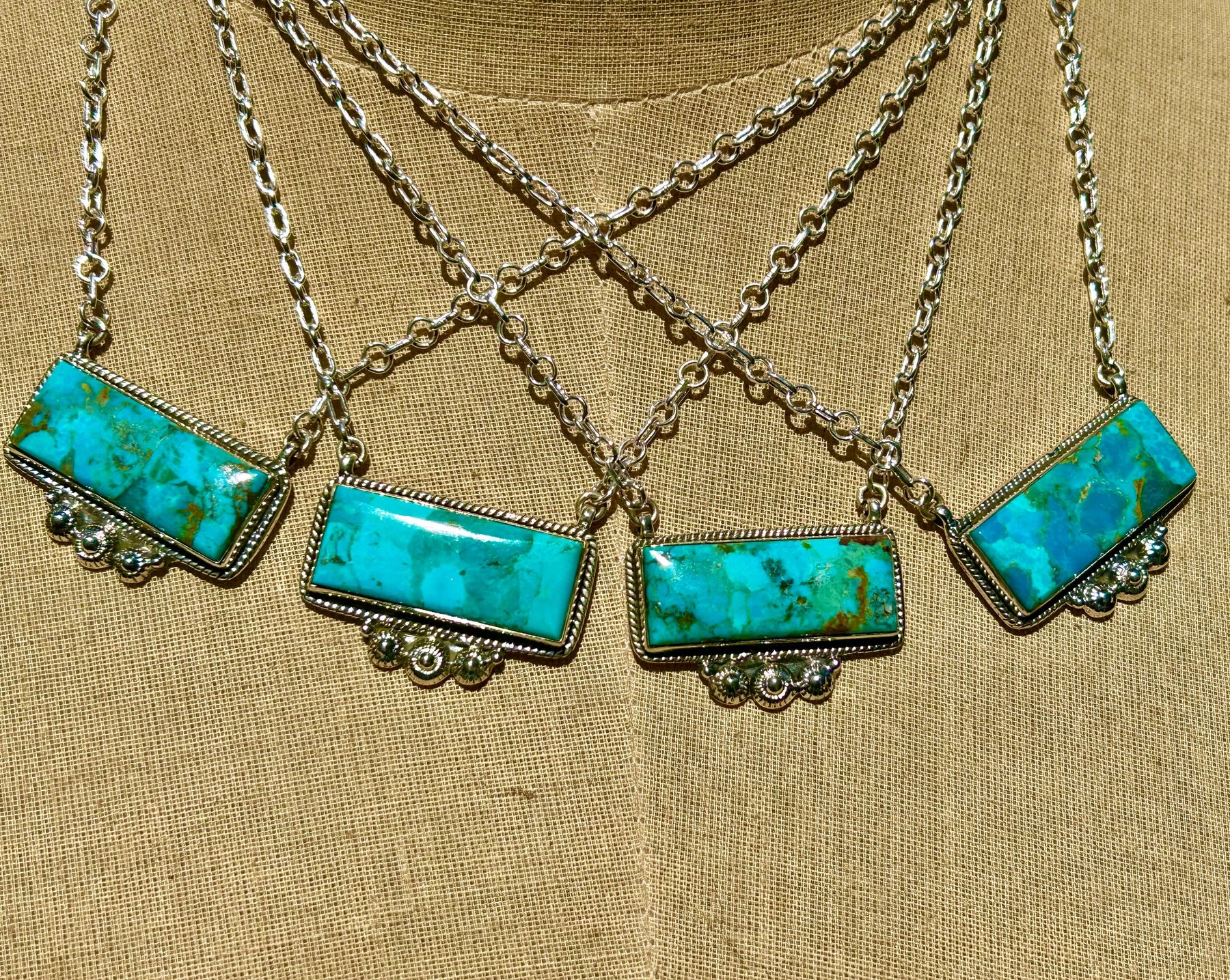 Kingman Turquoise Sterling Silver Bar Necklaces. The earthtone matrix in these bars is gorgeous. I love Kingman turquoise when they turn out so pretty. The true color of turquoise against the matrix is stunning. They really show off the neckline.