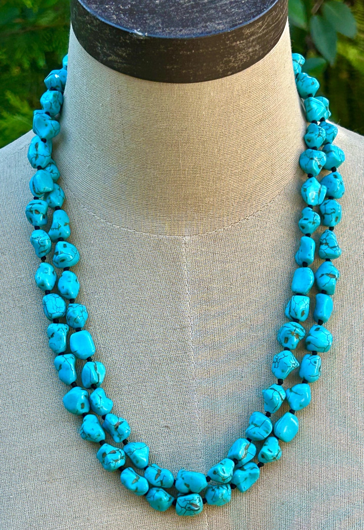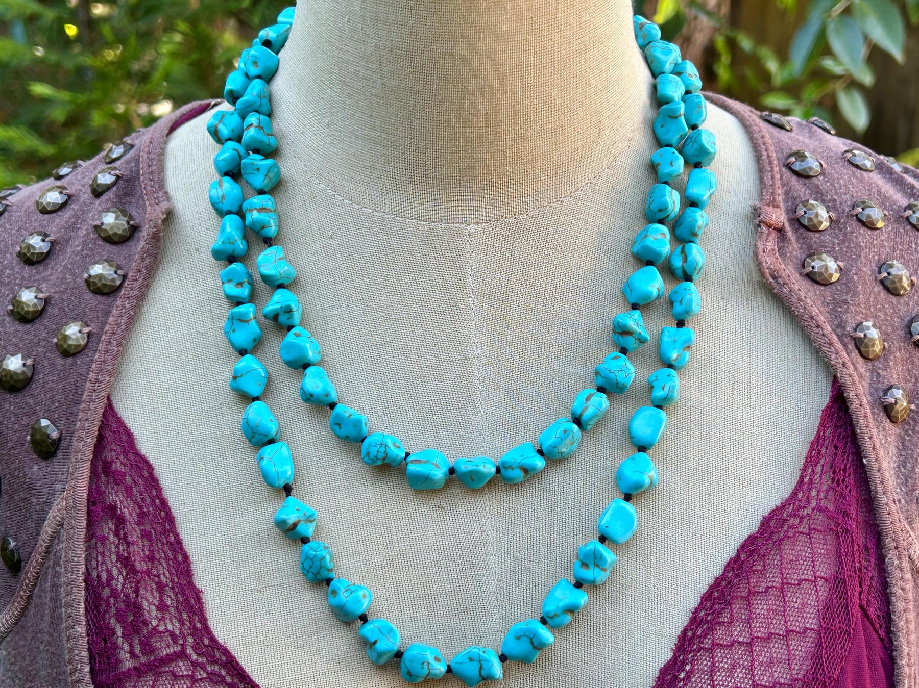 Turquoise Beaded Long Necklace: Hand Knotted Southwestern Boho Design