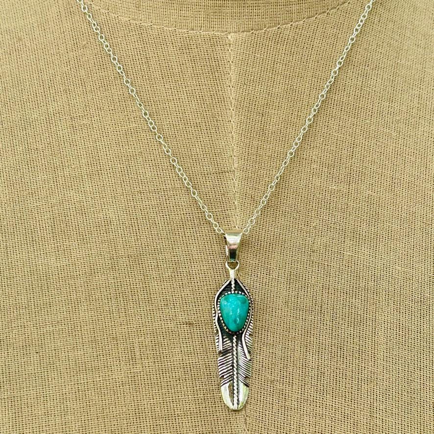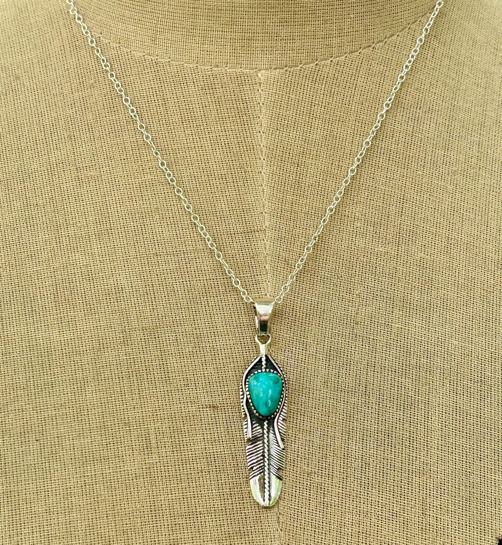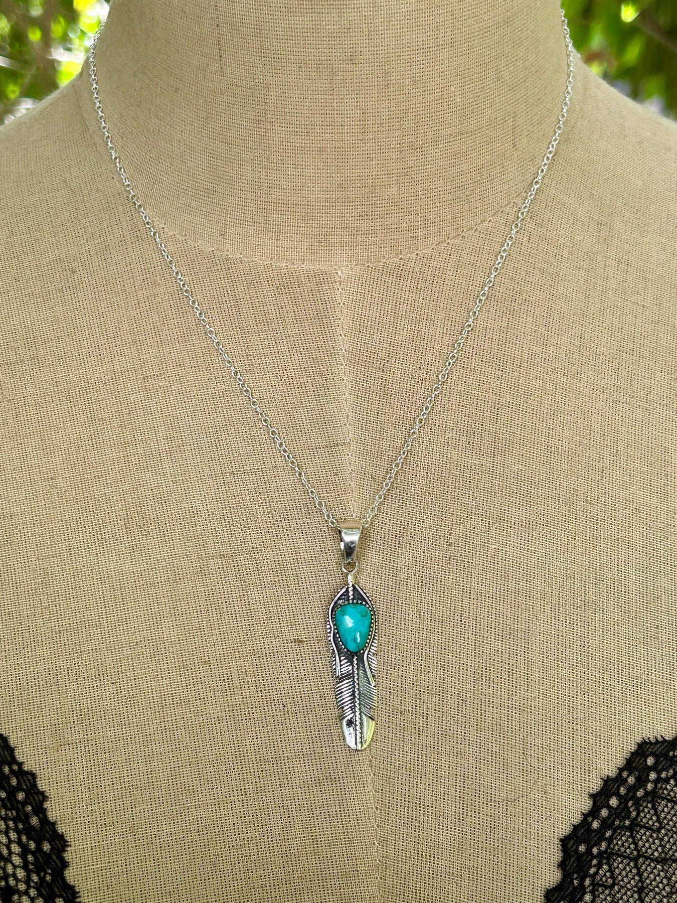 Genuine Turquoise Feather Necklace Pendant with Sterling Silver Chain. This necklace can go both ways to a man or a woman. Very beachy, surfy type of necklace with a very detailed feather made of genuine turquoise and sterling silver.