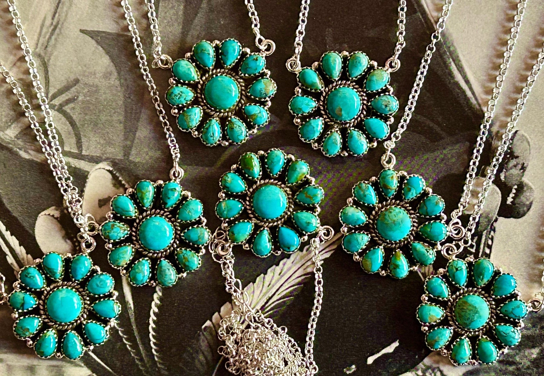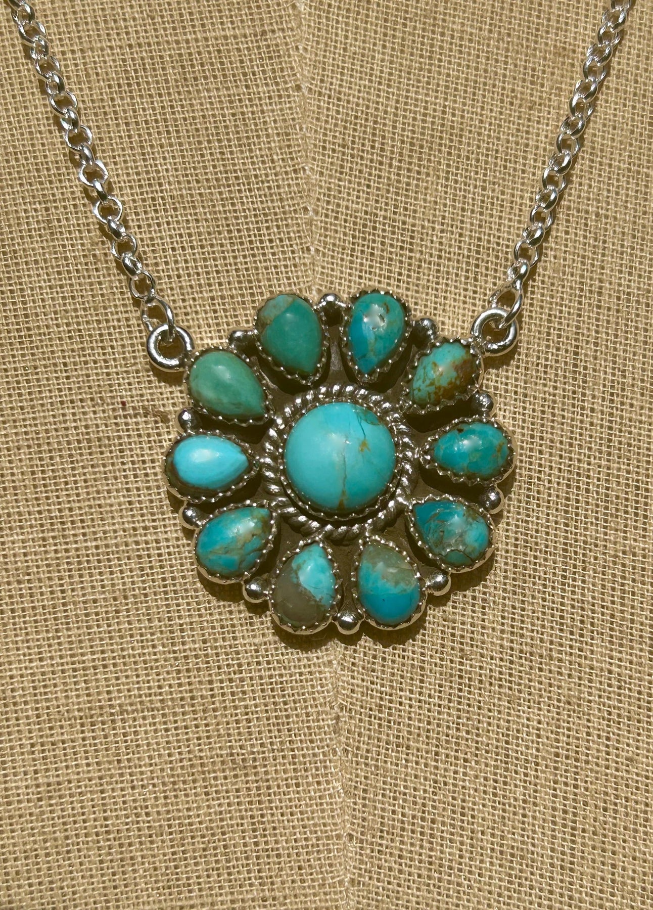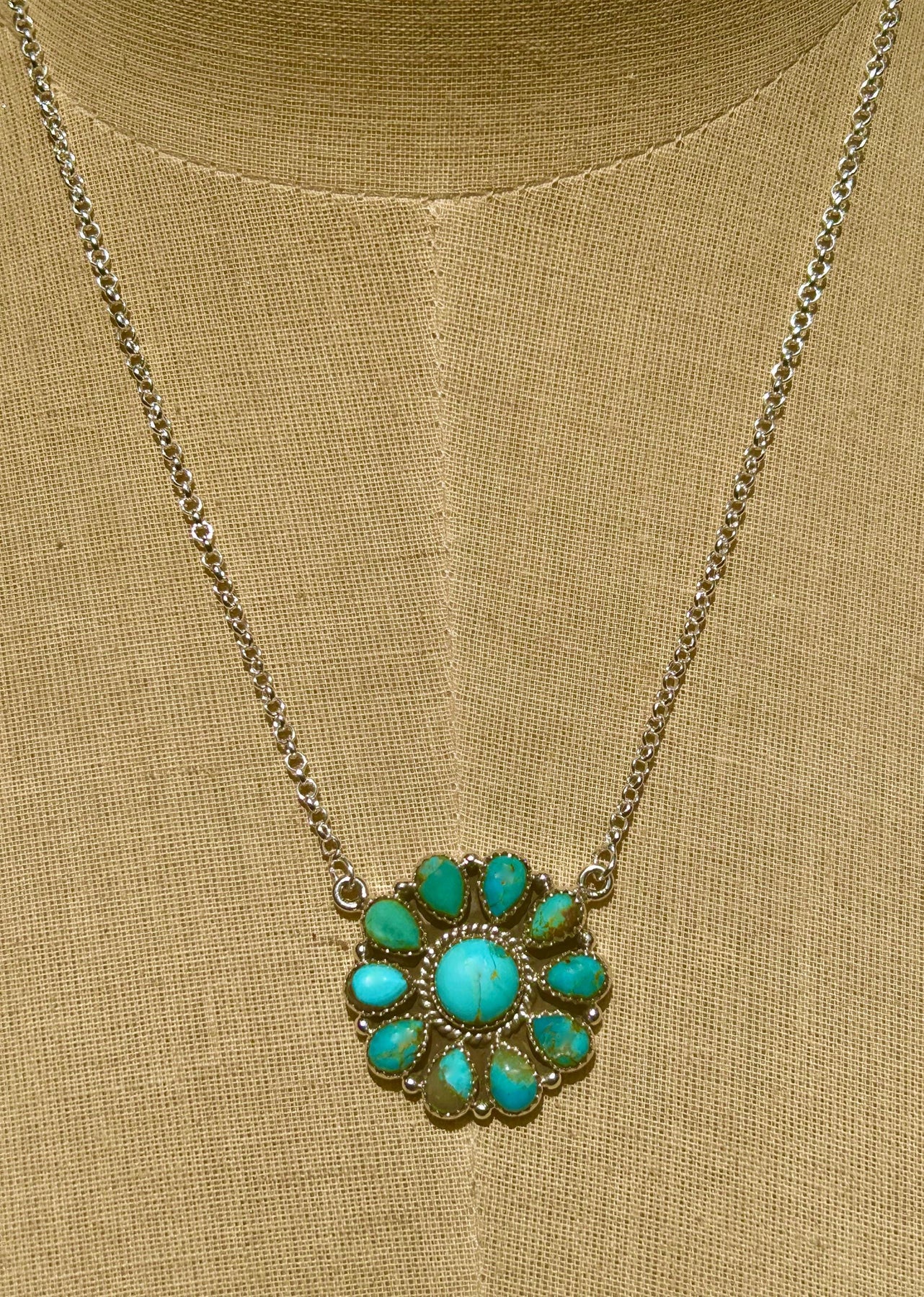 Kingman Turquoise Cluster Necklace: Sterling Silver, Southwestern Flower Pendant
