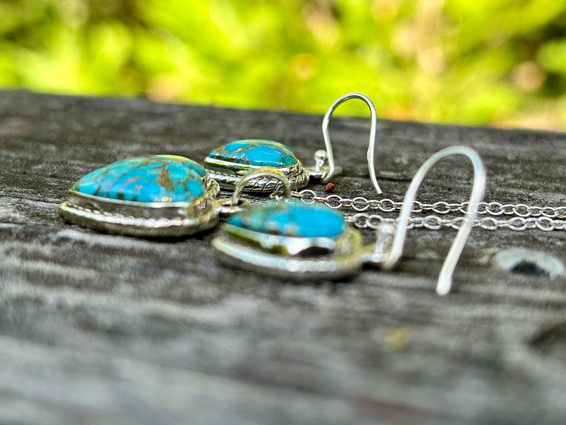 Turquoise Copper Matrix Heart Pendant & Earrings Set-Sterling Silver. This is such a sweet set for any female in your life especially yourself. This stunning Turquoise Copper Matrix Necklace and Earring Set brings together the natural beauty of turquoise with the warm shimmer of copper. The unique matrix pattern makes each stone one of a kind, creating a bold yet timeless jewelry set perfect for everyday wear or special occasions.