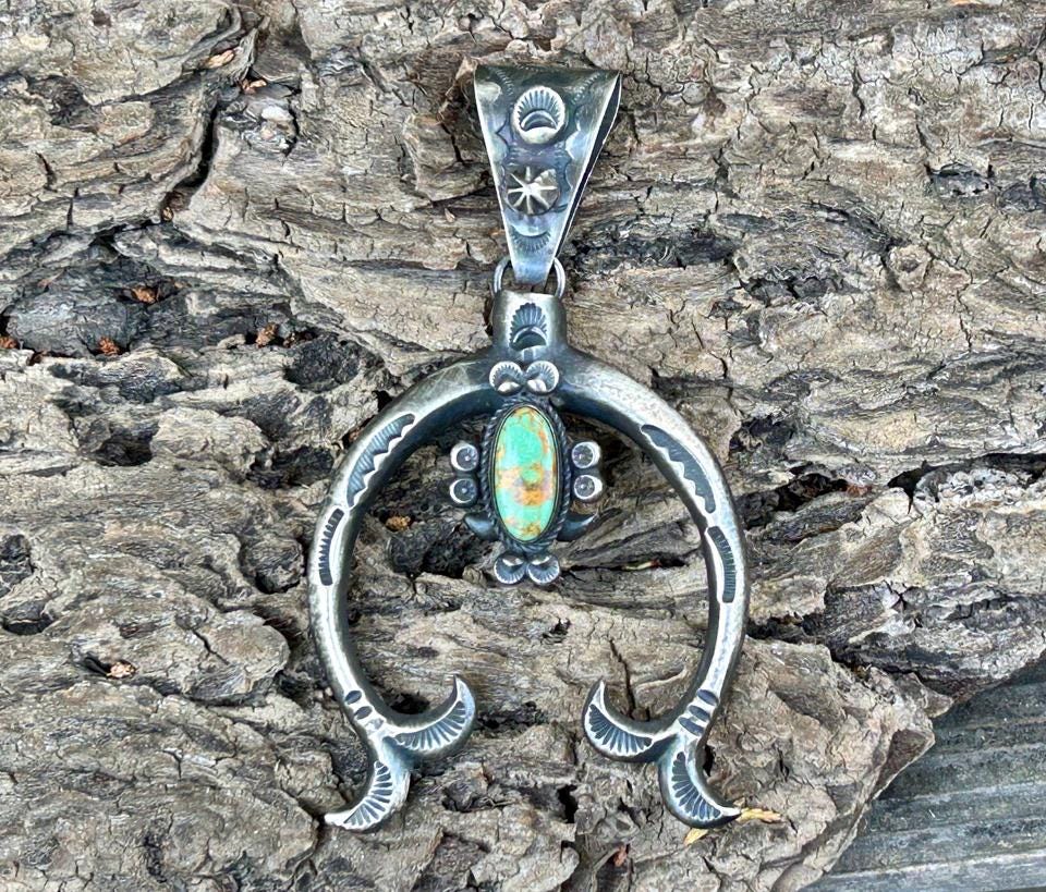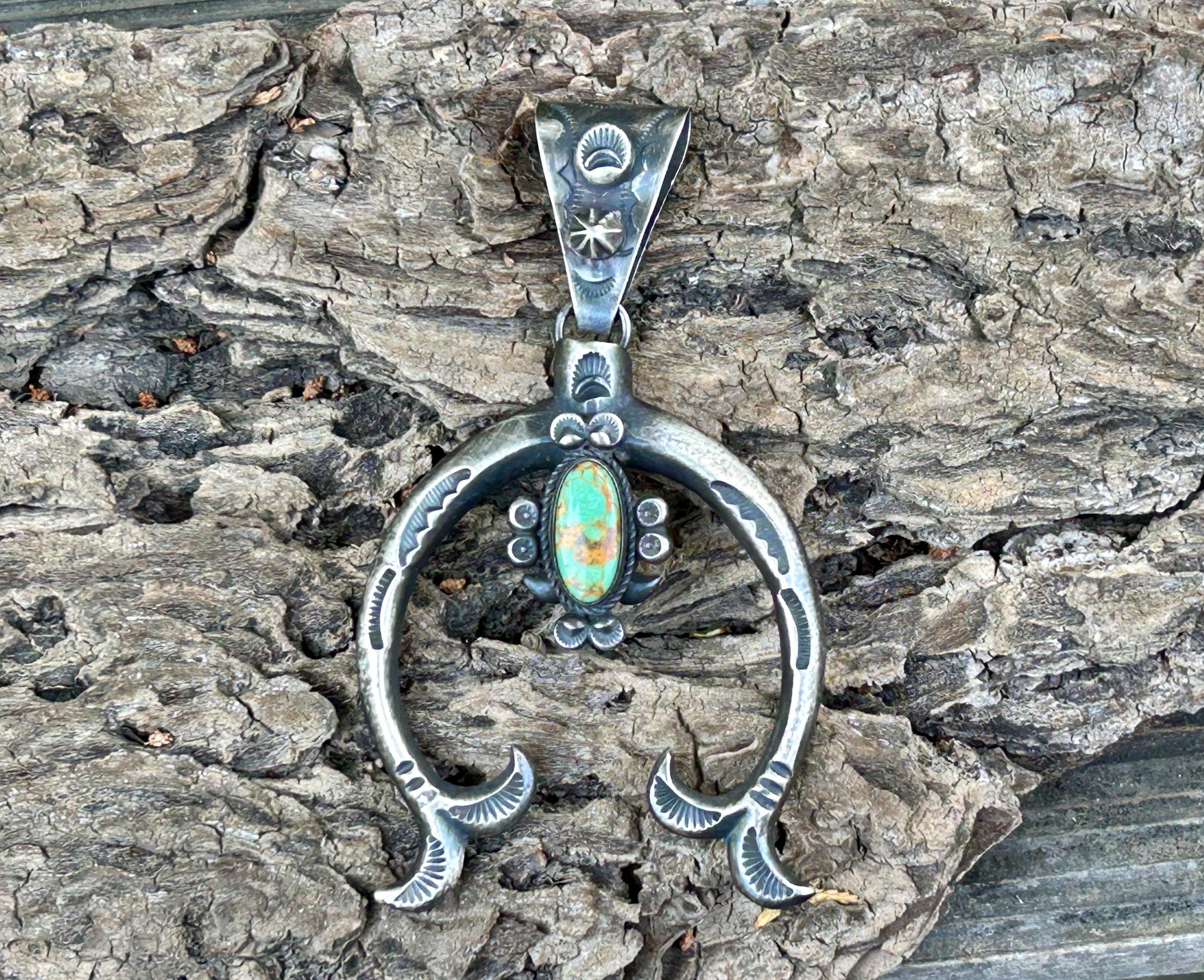 Royston Turquoise Dean Sandoval Naja Pendant: Sterling Silver Navajo Vintage Jewelry