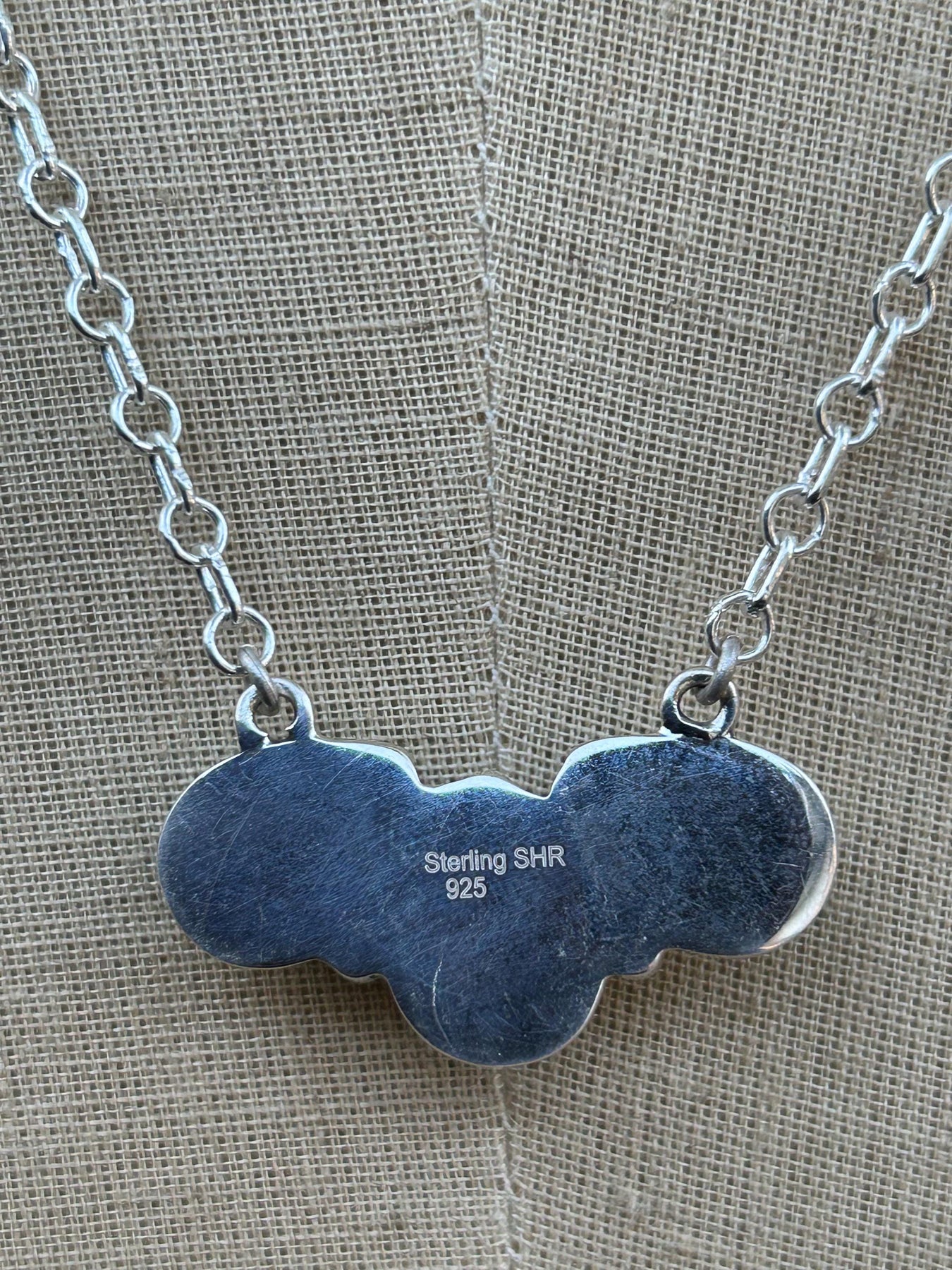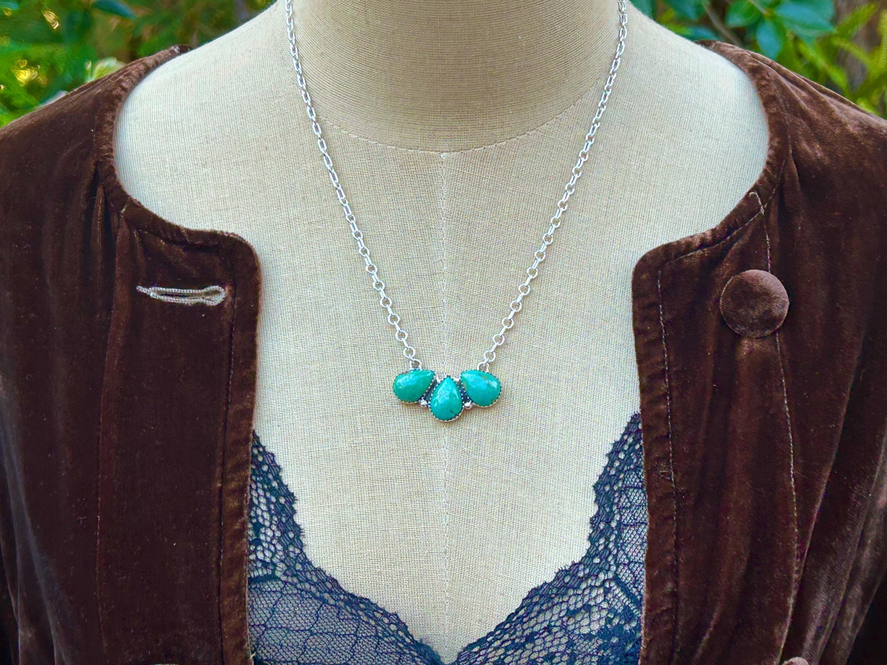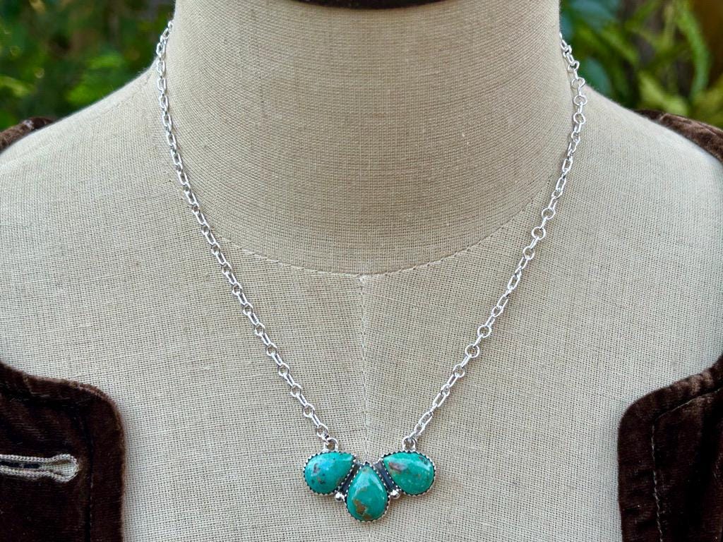This is a sweet 3 stone turquoise necklace. Kingman stones set in a teardrop cluster shape. Really pretty necklace that adds a pop of turquoise color around your neck. Perfect for the person that wants to make a simple turquoise statement.