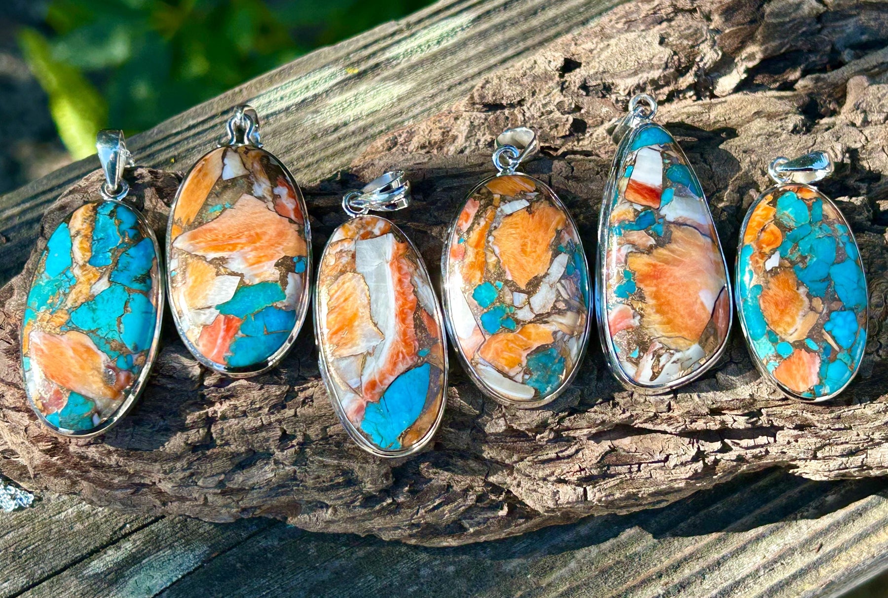 For all my Spiny Oyster fans (and there are a lot of you) here is what you asked for: More Turquoise and Spiny Oyster Silver Pendant/Necklaces. These are a crazy pretty example of Spiny Oyster I haven't seen in a long time. I picked out these stones specifically for you. Spiny Oyster always reminds me of a beautiful sunset. The lovely orange, yellow and turquoise blues are so pleasant to look at. Pretty large bails on all of them to accommodate any of your at-home chains. Sterling silver and a 18" Sterling silver chain in included.