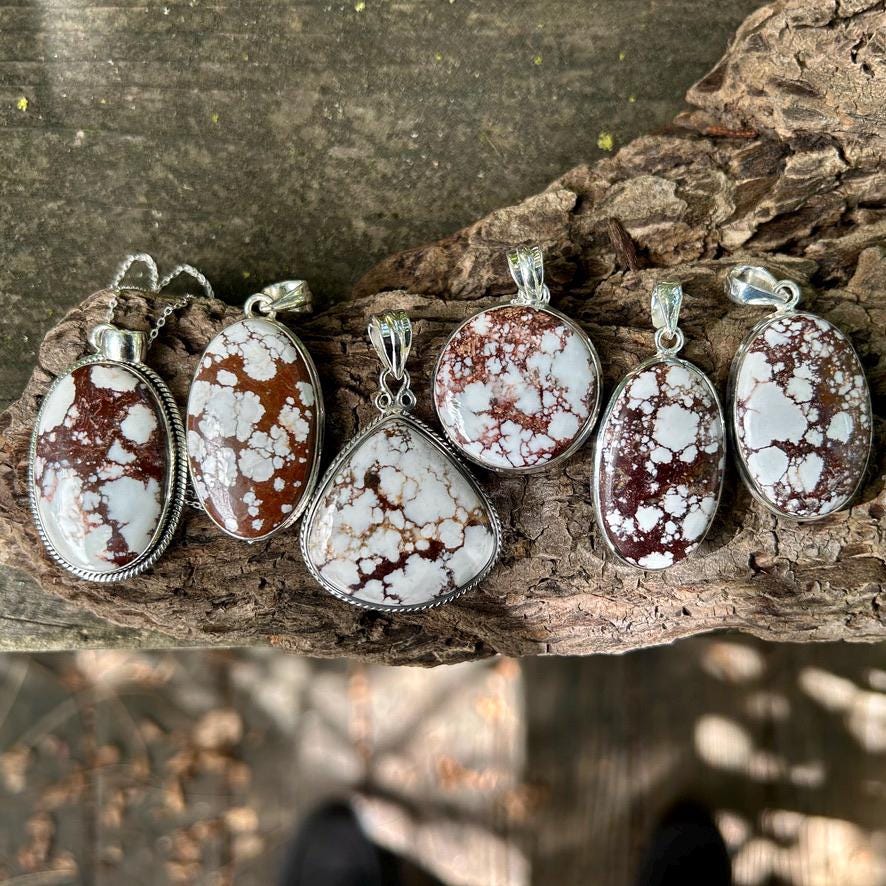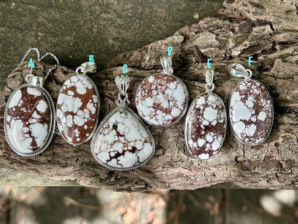 The beauty of Wild Horse can really be seen in these gorgeous pendants. The deep chocolate brown is a beautiful contrast against the white in the stone. It really stands out on the neck as a statement piece. Southwestern and cowgirl vibe all the way. Nice large bail to fit your other chains. 18" sterling silver chain included.
