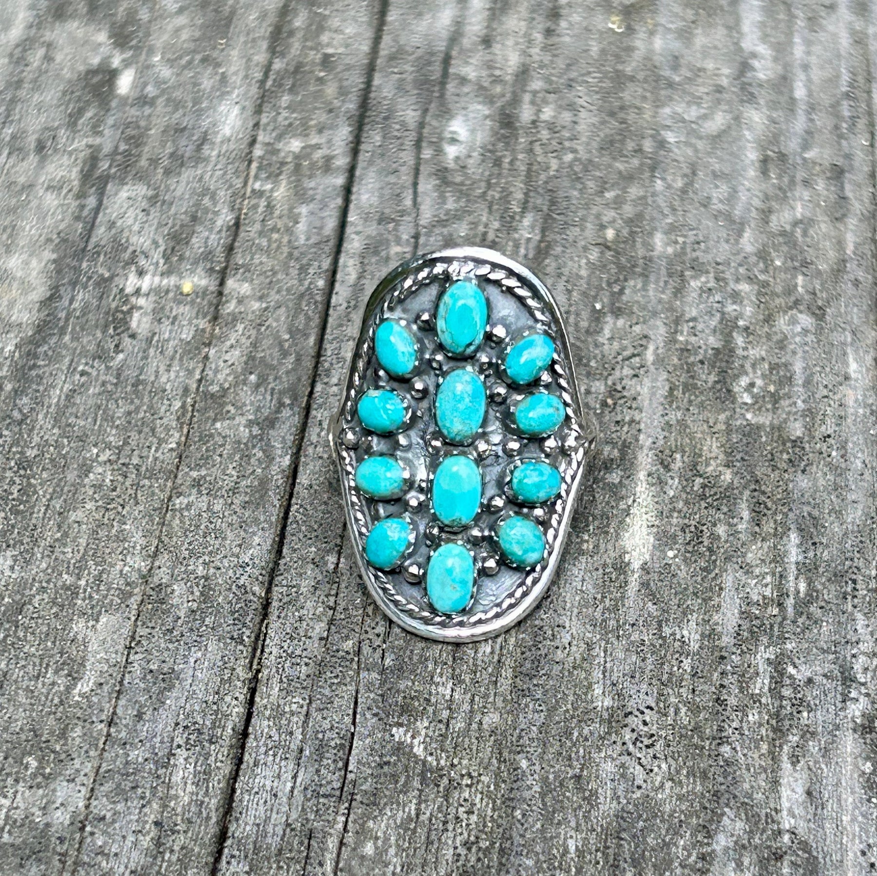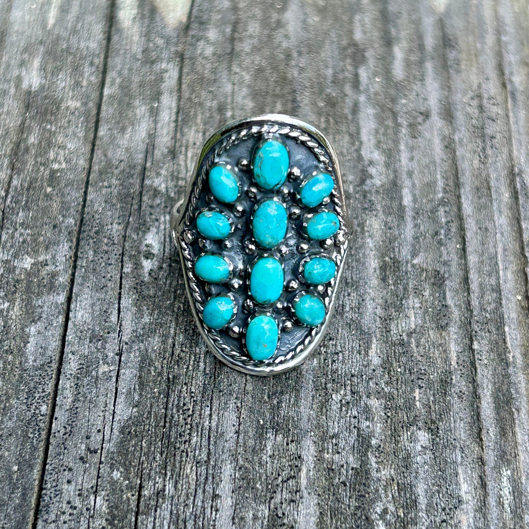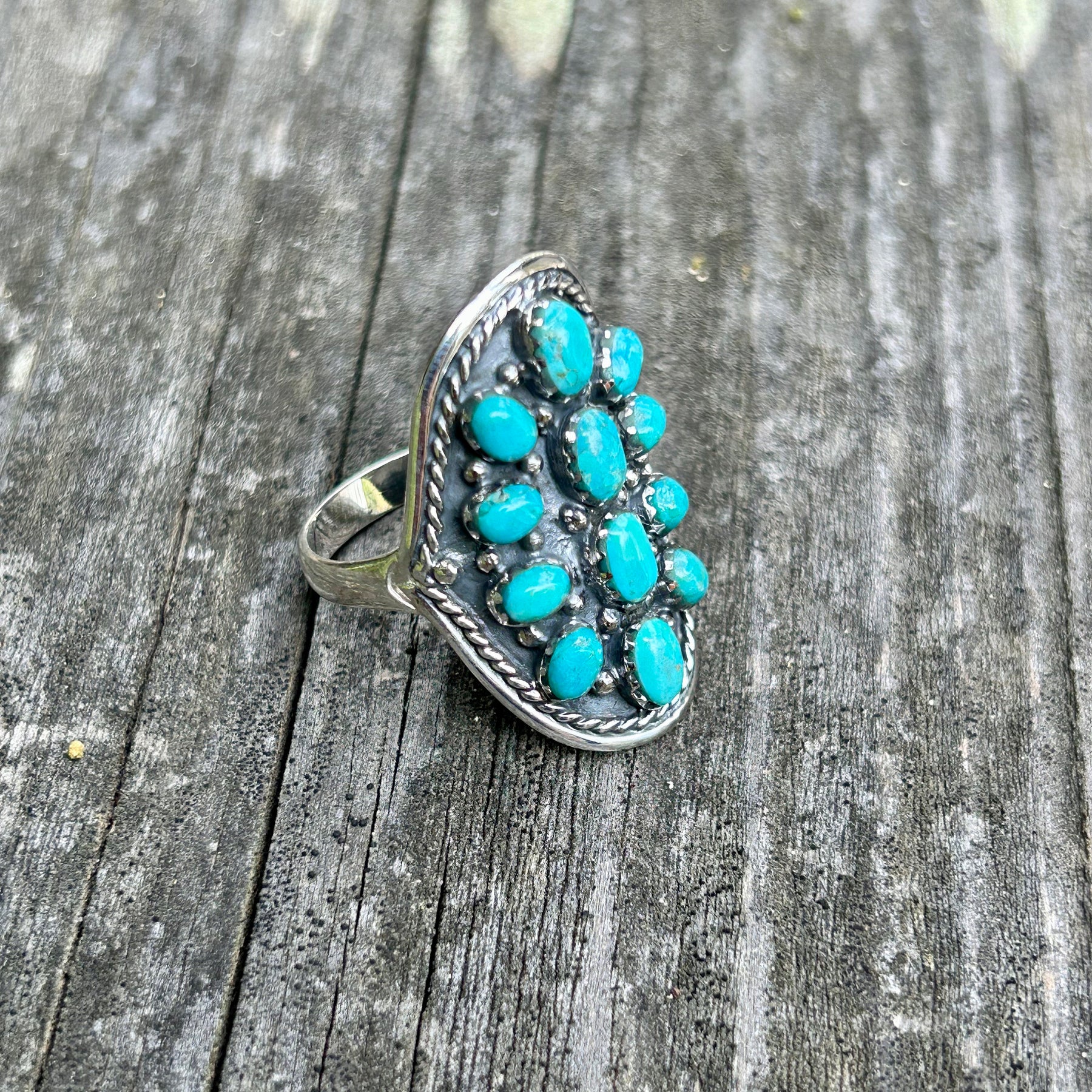 Genuine Turquoise Cluster Ring 925 Sterling Silver Turquoise Ring . This is a classic traditional style turquoise ring...looks great on men and women. Beautiful natural stones set in a cluster style...all hand bezelled. Saddleback style for comfort with rope design.