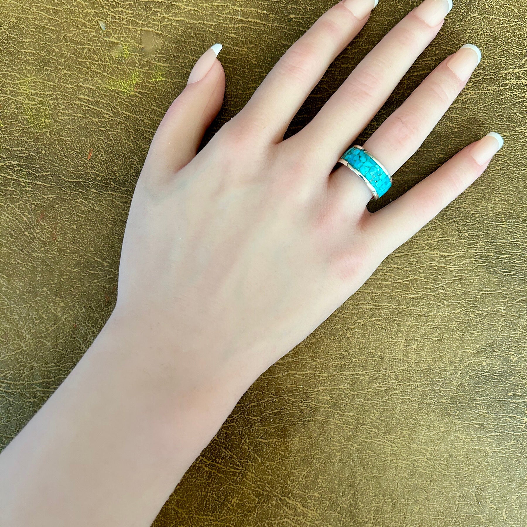 Genuine Turquoise Band Ring. This is a very pretty band ring. Genuine Turquoise chips set in Sterling Silver. Very comfortable too.