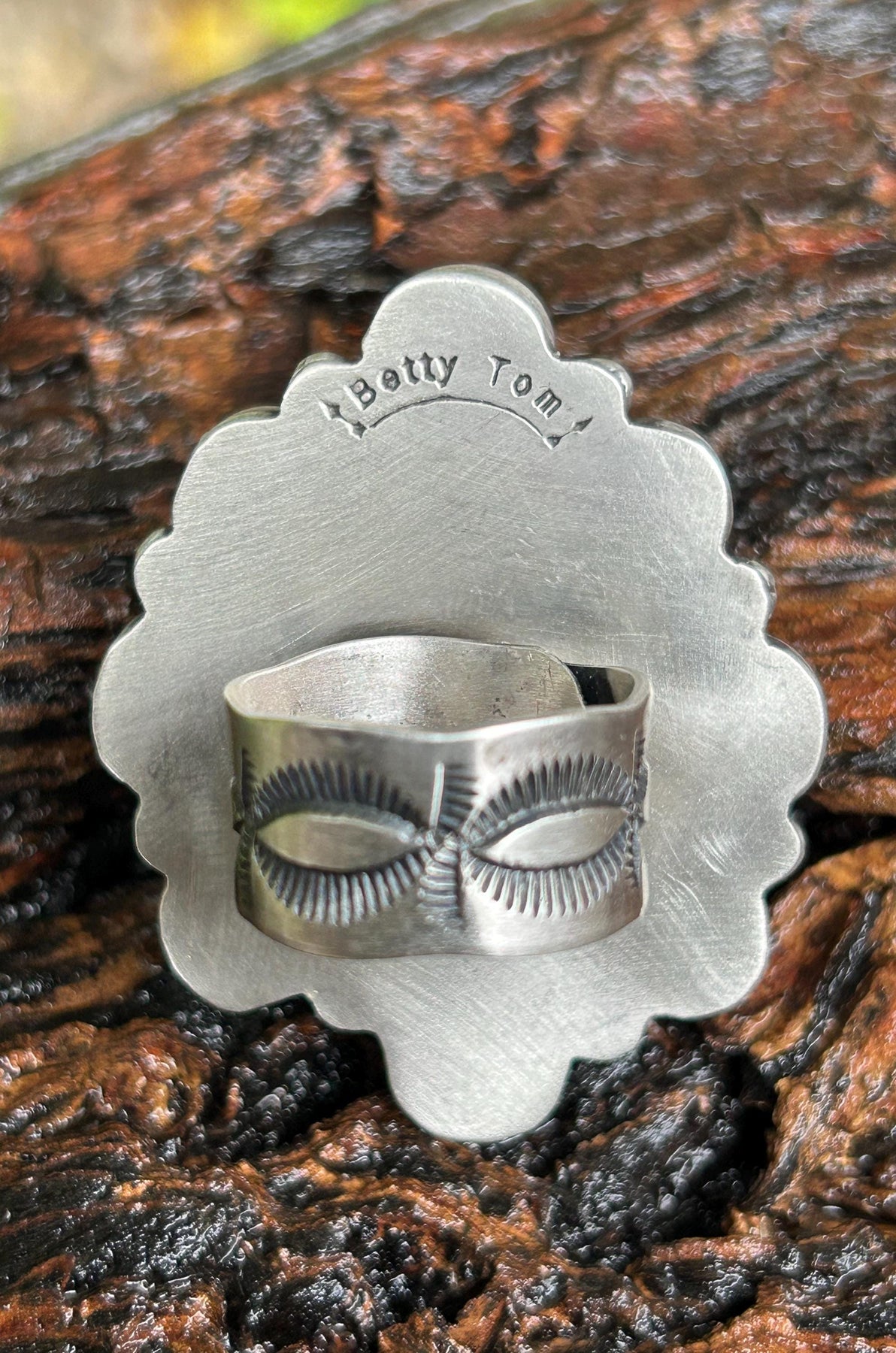 Specializing in traditional Navajo cluster work, Navajo silversmith Betty Tom was born & raised in Thoreau, NM. Betty started silversmithing right after high school, learning by watching her father. Mother of three and Grandmother of four, Betty still lives in Thoreau, and continues to provide the Southwest with collectible turquoise and silver jewelry. Highly collectible.