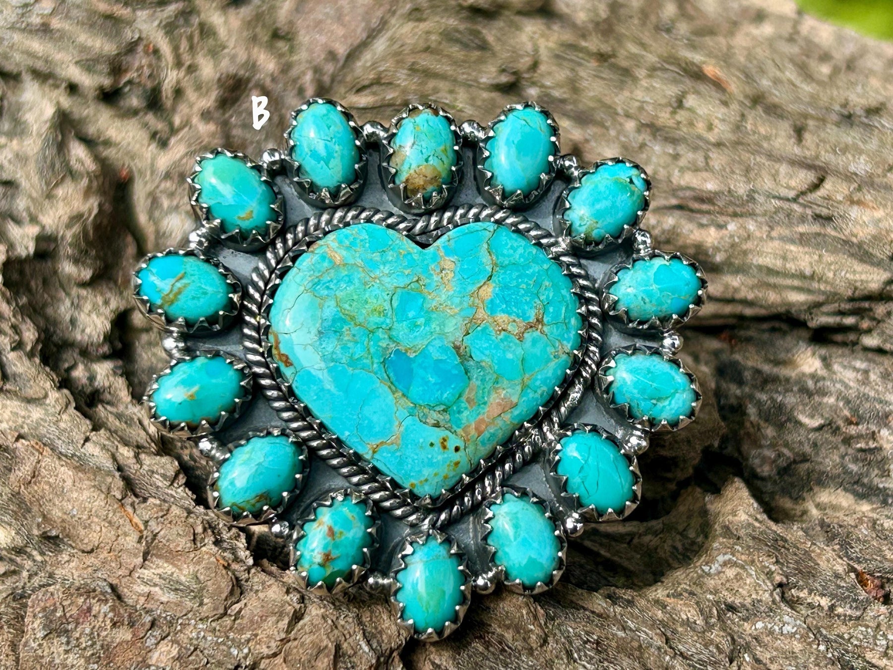 Fall in love with the natural beauty of this Kingman Turquoise Heart Ring. Handcrafted with genuine Arizona turquoise, this ring features a heart-shaped stone set in sterling silver for a timeless Southwest look. The adjustable band makes it easy to wear on any finger, offering both comfort and style. This turquoise heart ring is more than just jewelry-it's a symbol of love, strength, and connection to nature. Perfect as a thoughtful gift for her, a boho statement piece, or even a unique promise or engagement ring. Each piece is one-of-a-kind, with natural turquoise earthtone matrix that makes your ring truly special. These turned out so well. The matrix in these is to die for. There is even a couple of rings if you prefer them more clean without much matrix. Either way these are stunning. Truly a statement from the heart.