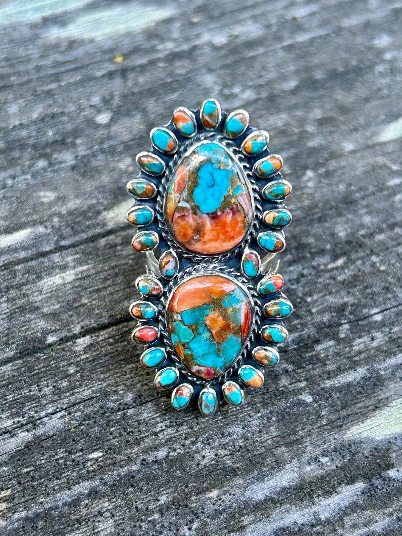 Turquoise Spiny Oyster Ring Gorgeous Spiny Oyster Sterling Silver Cluster Ring Statement Ring Southwestern Style Ring