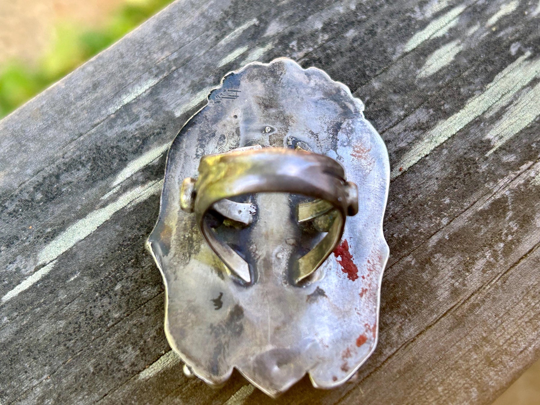Handmade circa 1960's Unmarked which was typical for the period. Provenance was procured from first owner who purchased this amazing ring from the Navajo artist directly in 1970's New Mexico. Gorgeous Silversmithing in this ring. I can't say 100% what kind of turquoise but my guess is natural Kingman. Beautiful turquoise blue color with natural earthtone matrix. 3 Prong shank with silver detail in middle prong. Size 7 28g 2" x1.5" *Free Shipping
