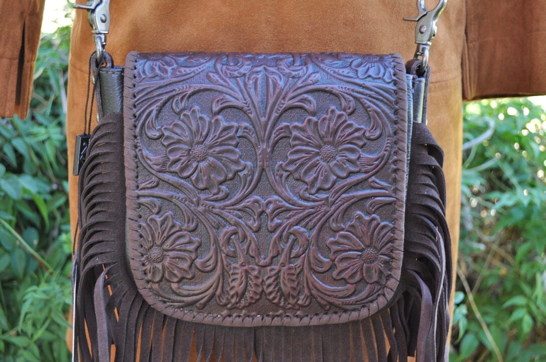 Western Leather Tooled Fringe Crossbody Bag 100% Genuine Leather Bag.....These bags are so well made. Vintage Tooled Leather with just the right amount of Fringe to say "Cowgirl". Deep rich dark brown color really brings out the tooling in the leather. Adjustable shoulder strap makes just the perfect length.