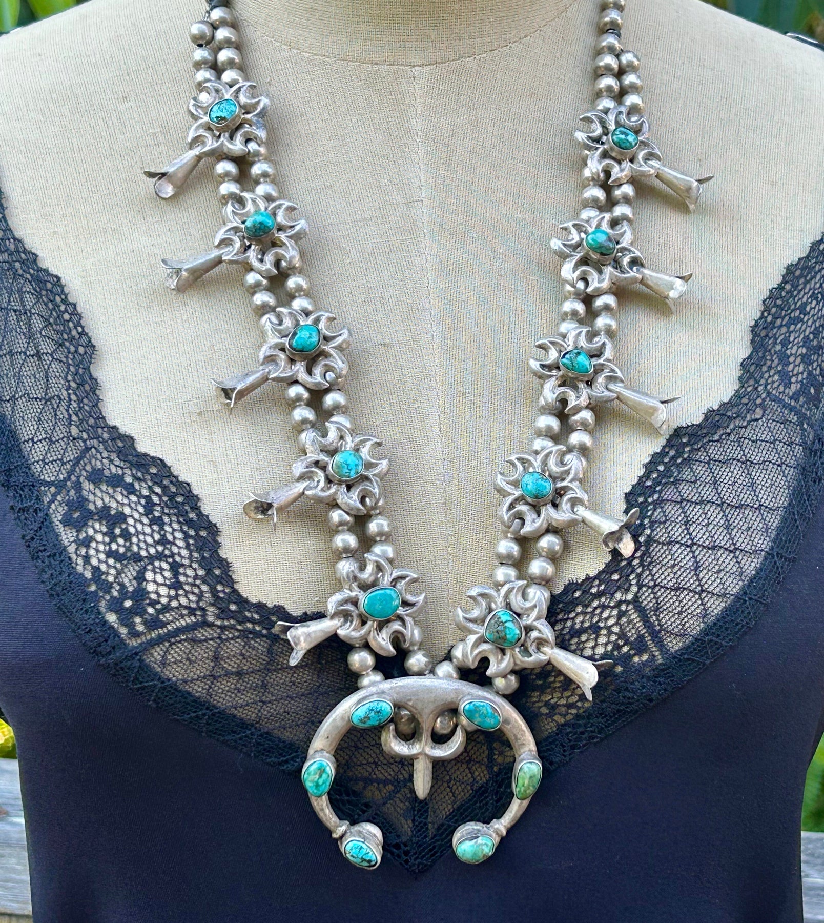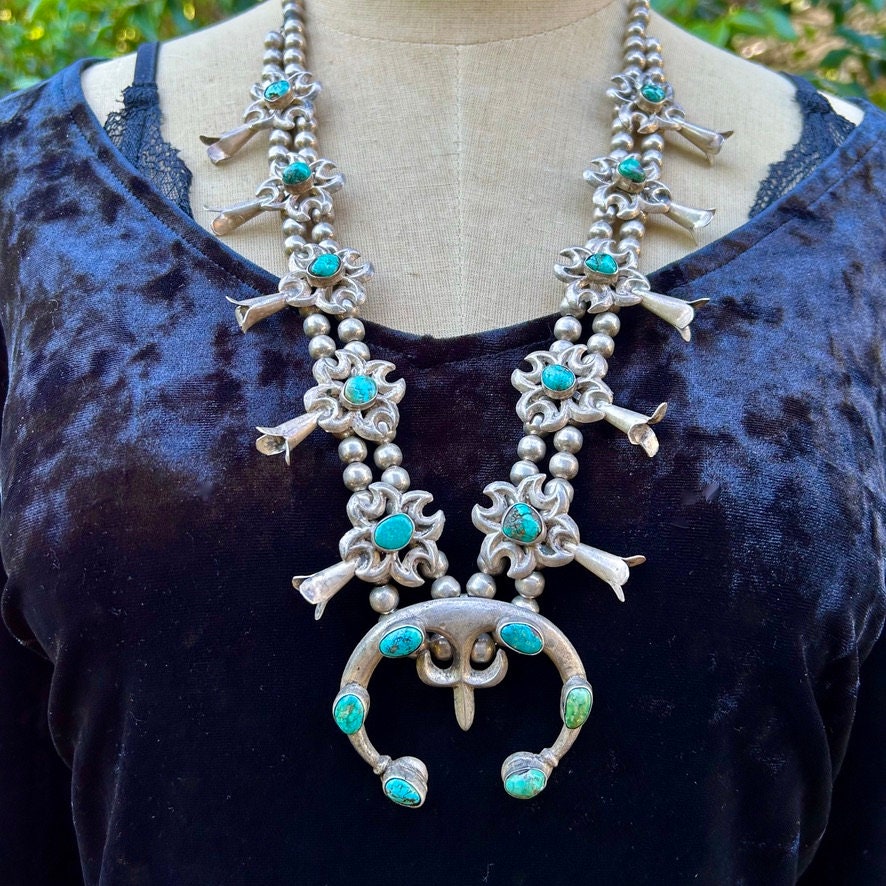 Vintage Squash Blossom Navajo Necklace. Circa 1960's Sterling, Navajo Squash Blossom Necklace. A marvelous example of Navajo silver smithing, this beautiful turquoise-set squash blossom necklace has it all -- color, quality, and a lovely floral design going up the sides. The look is iconic Native American at its vintage best. This necklace is set with superbly bright blue turquoise and a profusion of squash blossoms. The Naja is surrounded by bezel set turquoise cabachons with a traditional Fleur-De-Lis (cross like symbol) Excellent condition for it's age.
