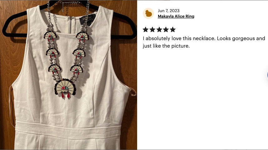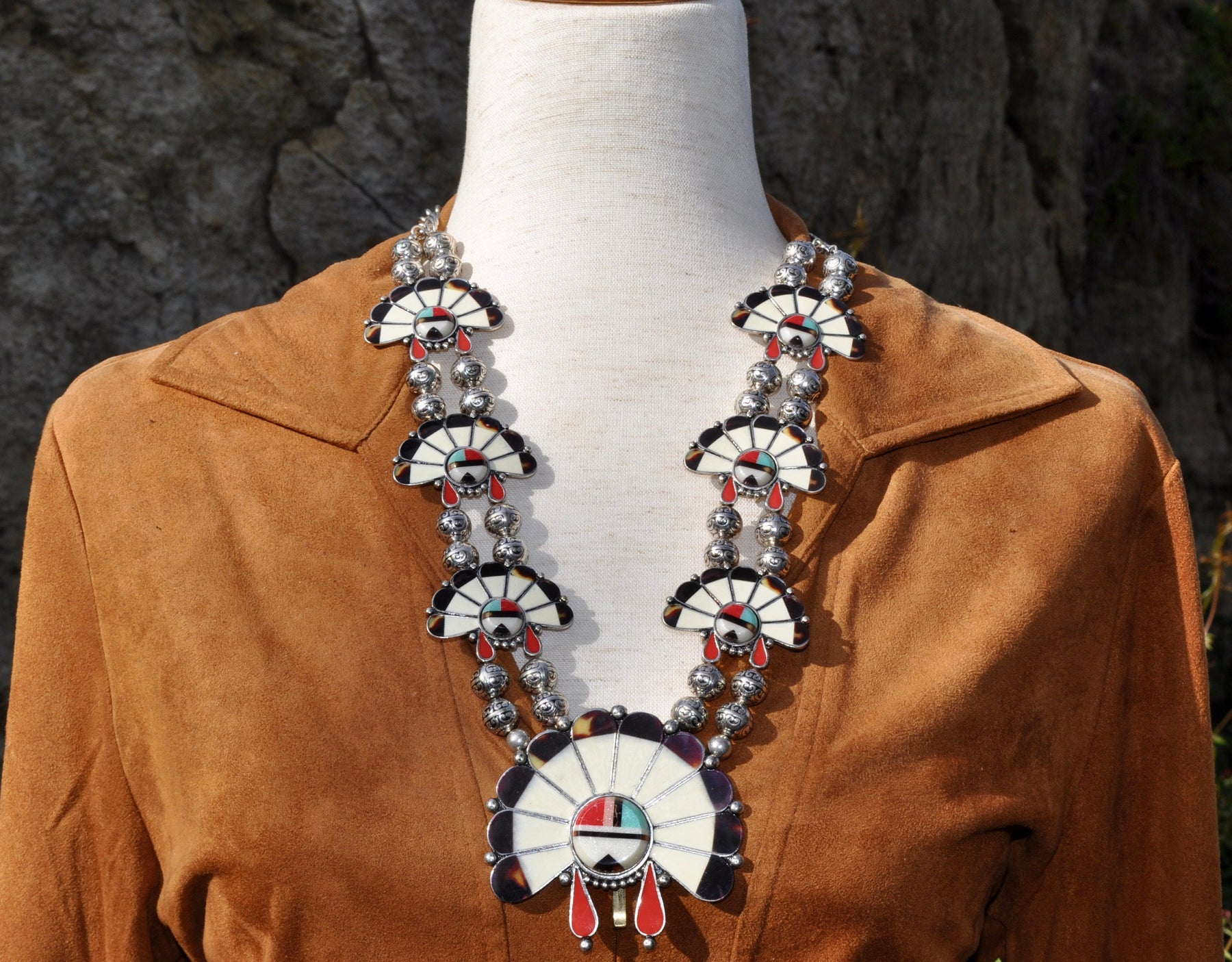 This squash blossom necklace features a striking enamel Sunface design, carefully crafted as a reproduction of classic Southwestern jewelry. The vibrant enamel colors and bold silver-tone setting make it a standout statement piece. A beautiful nod to southwest designs, this necklace adds heritage charm and vintage flair to any outfit.