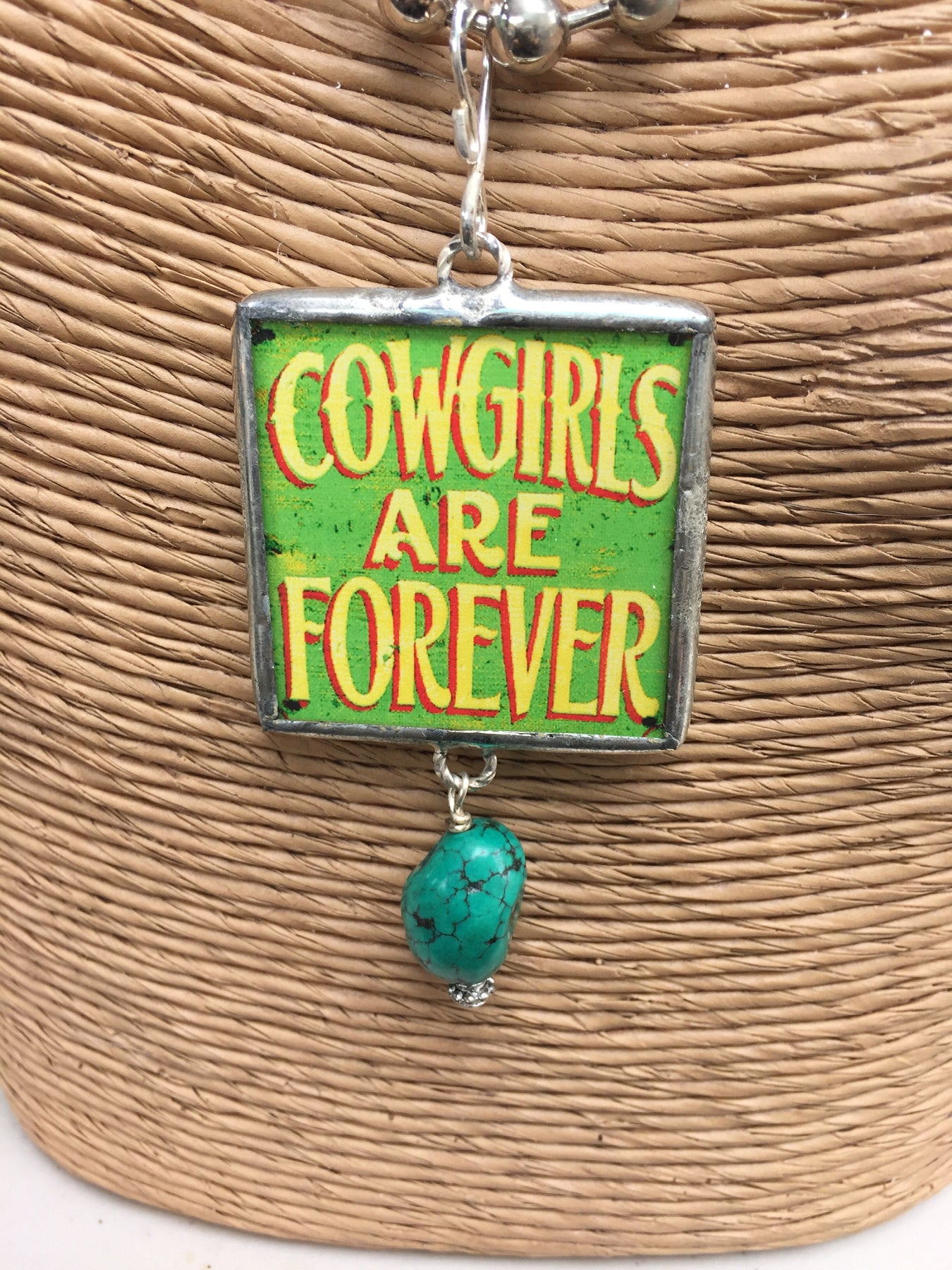 COWGIRLS ARE FOREVER nothing could be more true. This is such a cool pendant. It is reversible so one side says " COWGIRLS ARE FOREVER" and the other side has a vintage picture of two cowgirls with their horse. Also hanging from the frame is a beautiful genuine turquoise nugget with a nice amount of matrix. Included is a silver plated beaded chain. Frame is soldered in glass.