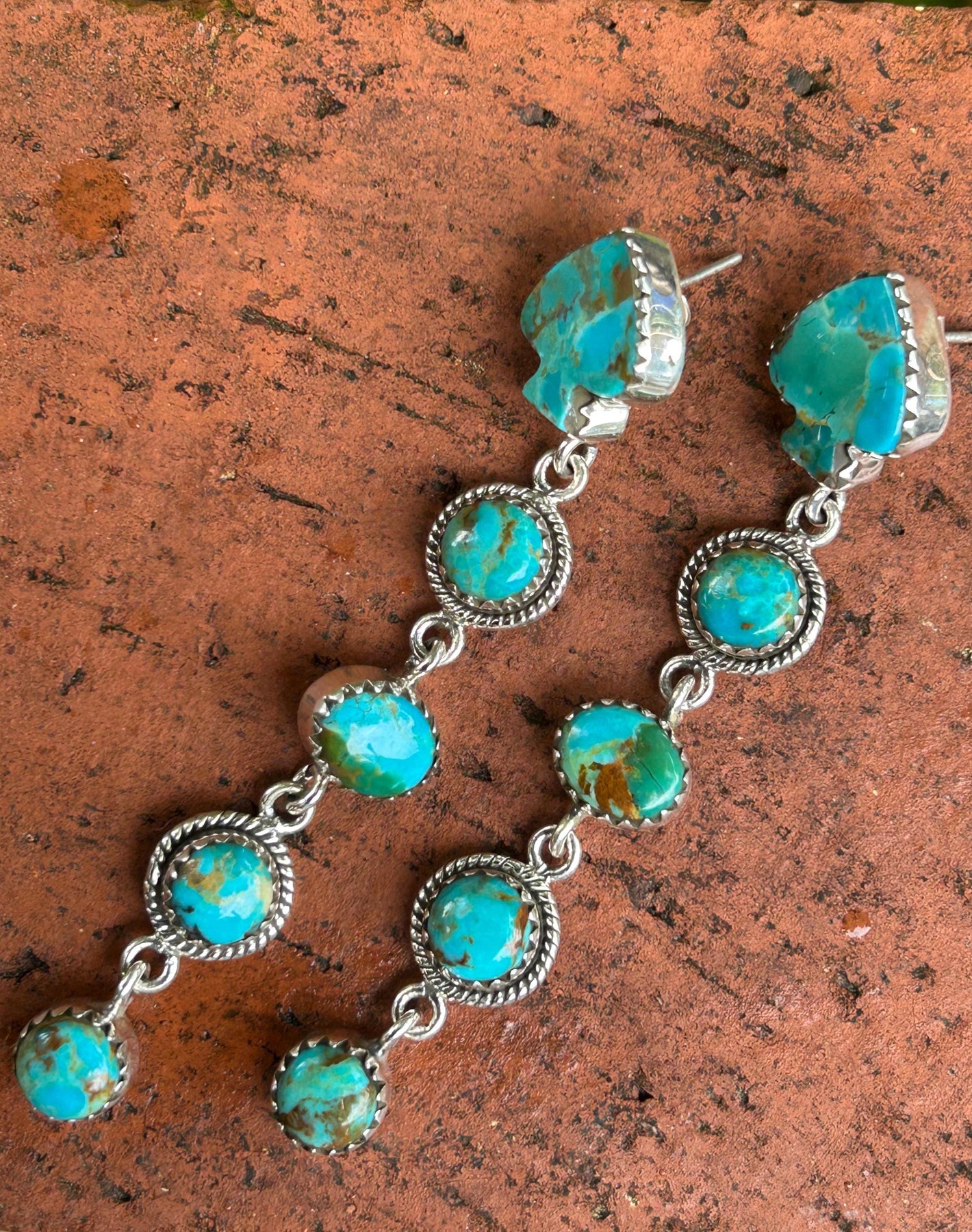 These are a gorgeous pair of Kingman Turquoise Long Earrings with the Ace of Spades at the post. These are different and unique. Sterling silver. The Matrix in these earrings is exceptional. Truly a gorgeous pair of earrings. They are a perfect length of 3" which really isn't that long. Just long enough.