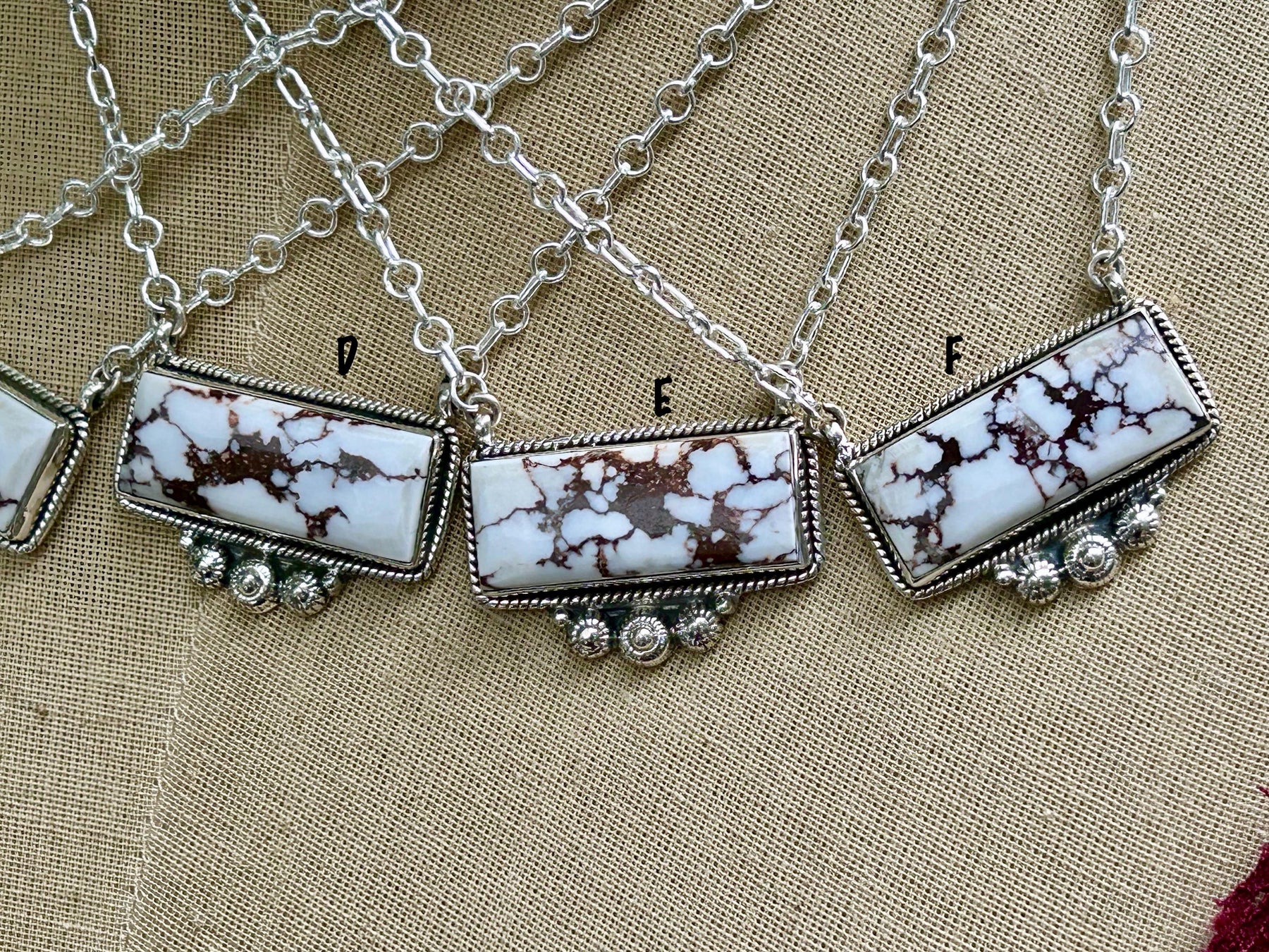 Wild Horse Turquoise Sterling Silver Bar Necklaces. The earthtone matrix in these bars is gorgeous. I love Wild Horse turquoise when they turn out so pretty. The true color of the white gemstone against the matrix is stunning. They really show off the neckline.